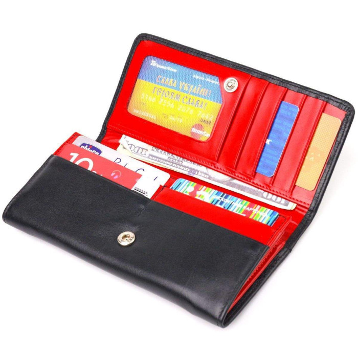 Оригінальний жіночий гаманець, з натуральної гладкої шкіри, чорний зовні та червоний – усередині. Аксесуар має три основні відділення, в які поміщаються купюри всіх номіналів, дві перегородки, одна з них на блискавці, одинадцять кишень для карток, одна з яких під сіточкою, монетниця на блискавці - зовні та одна прилегла кишеня. Закривається аксесуар клапаном на кнопку. Відмінний аксесуар, надійного виробника, який прослужить дуже довго.
