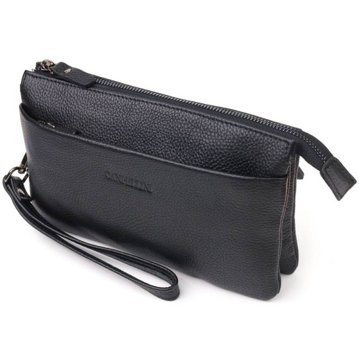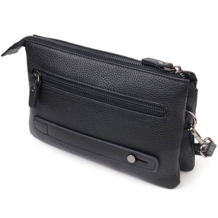 Оригінальний клатч для чоловіків з натуральної якісної шкіри. Аксесуар має одне основне відділення, всередині якого дві кишені на блискавках і два осередки для кредитних карток. Зовні у виробі розташовані дві кишені на лицьовій та тильній стороні, що закриваються на блискавку. Внизу аксесуара є ремінець для носіння на руці, що дуже зручно у використанні, також є кистьовий ремінь, що знімається. Чим зручний клатч - у нього Ви можете покласти все необхідне і все буде під рукою.