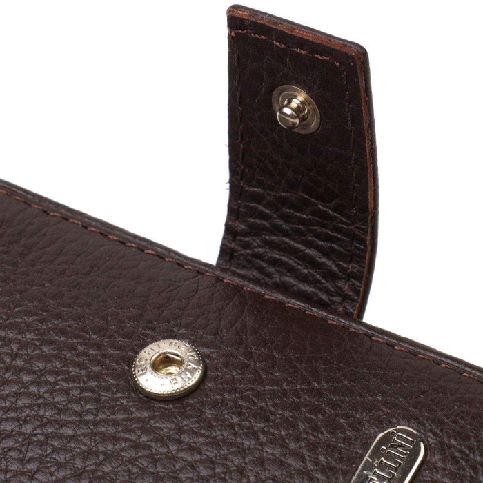 Надійний чоловічий гаманець середнього розміру із натуральної зернистої шкіри флотар. Аксесуар має основне відділення для купюр з перегородкою, чотири осередки для карток, дві кишені під сіточкою, три прилеглі кишені та монетницю. Гаманець складається навпіл, закривається хлястиком на кнопку. На лицьовій стороні в правому нижньому кутку розташований металевий логотип компанії виробника. Купуючи шкіряний гаманець у нашому магазині, Ви отримуєте модний, стильний аксесуар, який прослужить не один рік.