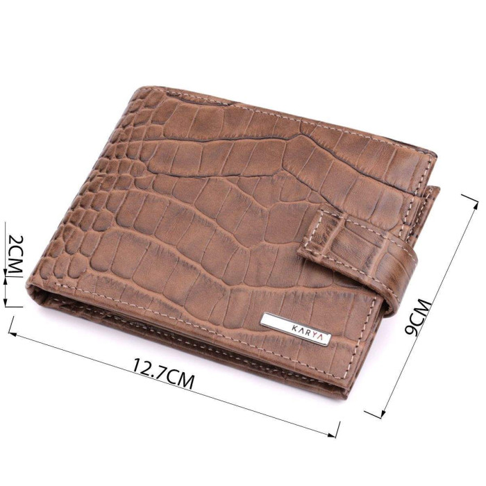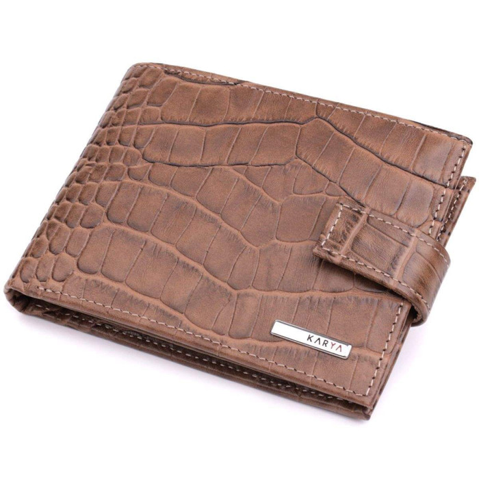 Зручний чоловічий гаманець із натуральної шкіри із тисненням під крокодила, у красивому коричневому кольорі. Виріб закривається на хлястик із кнопкою. На лицьовій стороні у вигляді декору розташований логотип виробника. Аксесуар упакований у фірмову коробочку. Вироби з натуральної шкіри завжди будуть чудовим подарунком для близької людини.