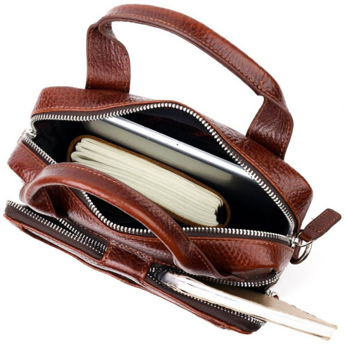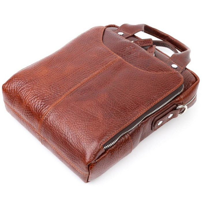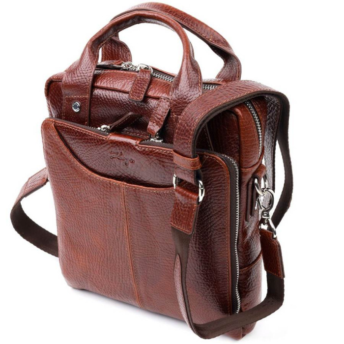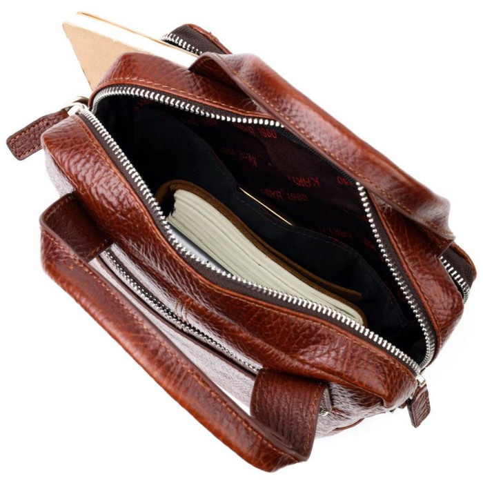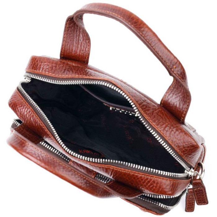 Чоловіча сумка коричневого кольору з натуральної шкіри високої якості. Аксесуар має надійну фурнітуру сріблястого кольору та міцну підкладку. Виріб упакований у фірмовий текстильний мішок Karya. Якісна чоловіча сумка з натуральної шкіри завжди була відмінним подарунком для чоловіка будь-якого віку.