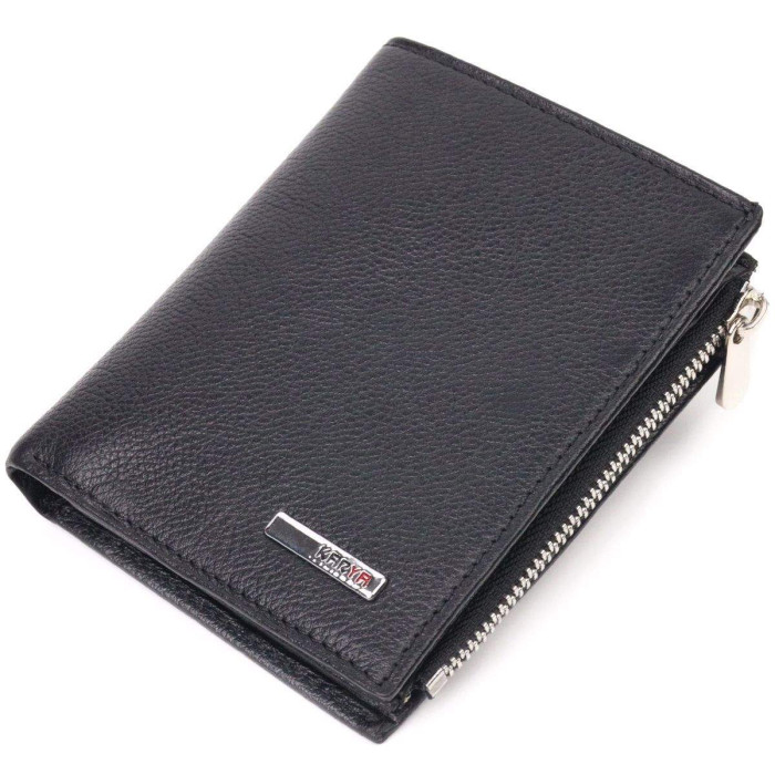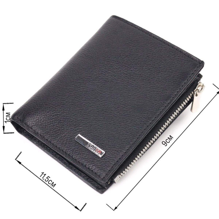 Чудовий компактний гаманець із натуральної шкіри високої якості, виріб класичного чорного кольору. Усередині є відділення для купюр, десять осередків для кредитних карток, монетниця на блискавці та чотири приховані кишені. У виробі використано якісну фурнітуру, а також міцну фірмову підкладку. Закривається модель у дві додавання на кнопку.