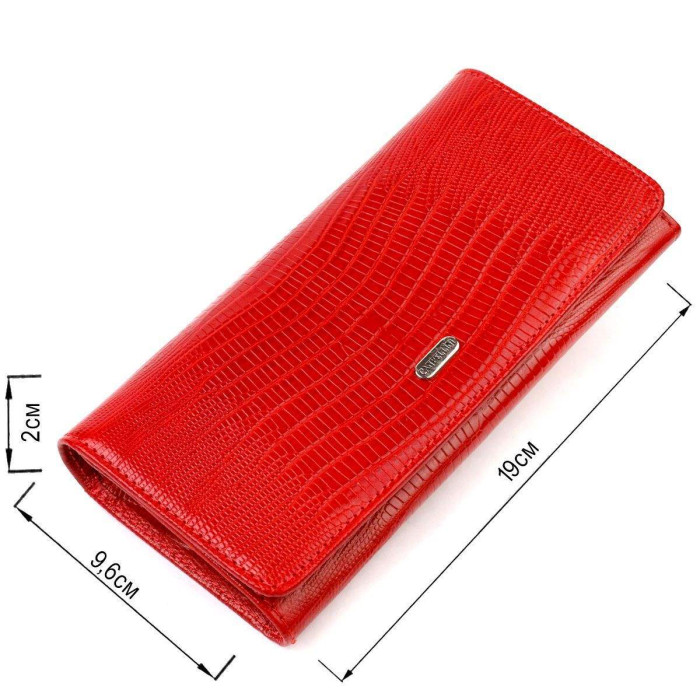 Яскравий фактурний жіночий гаманець з натуральної шкіри з тисненням під рептилію. Аксесуар має три основні відділення, в які поміщаються купюри всіх номіналів, дві перегородки, одна з них на блискавці, одинадцять кишень для карток, одна з яких під сіточкою, монетниця на блискавці зовні та одна прилегла кишеня. Закривається аксесуар клапаном на кнопку. Відмінний аксесуар, надійний виробник, який прослужить дуже довго.