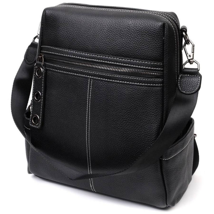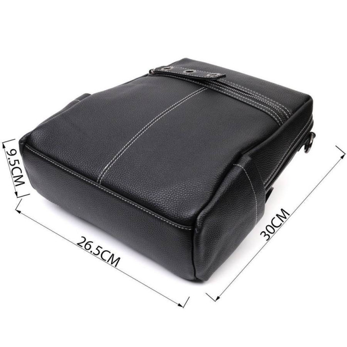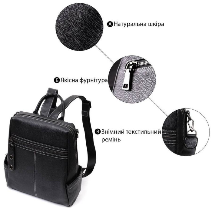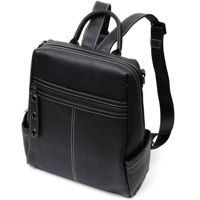 Місткий жіночий рюкзак з натуральної шкіри, прошитий білим рядком, що надає йому стилю та цікавого вигляду. Аксесуар складається з одного відділення, що закривається на блискавку всередині якого знаходиться дві кишені на блискавках, а зовні також дві кишені на блискавках і дві бічні кишені. Носити сумку можна на спині, в руках та через плече. В аксесуарі використано якісну фурнітуру кольору темного срібла.