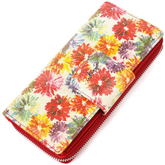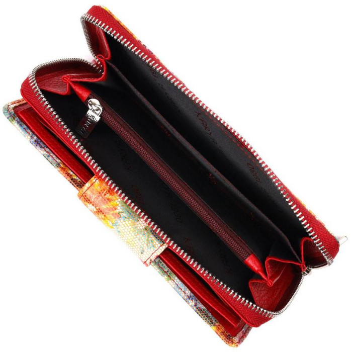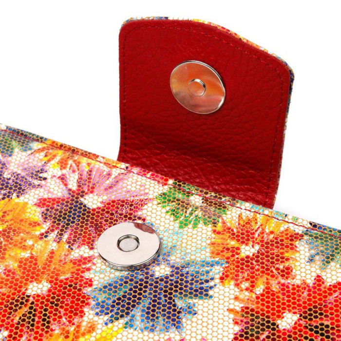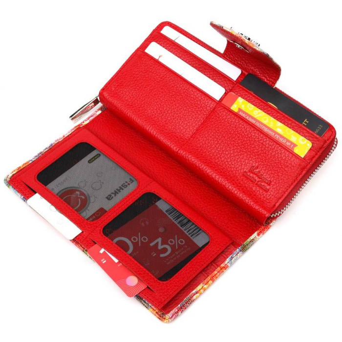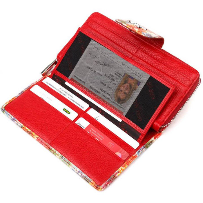 Яскравий жіночий гаманець із якісної натуральної шкіри. Виріб складається з двох частин, перша - для купюр у нескладеному вигляді та монет, що закривається на блискавку, друга для карток та документів, закривається клапаном на магніт. Запакований аксесуар у фірмову коробку та пакет бренду. Вироби з натуральної шкіри завжди будуть чудовим подарунком для близької людини.