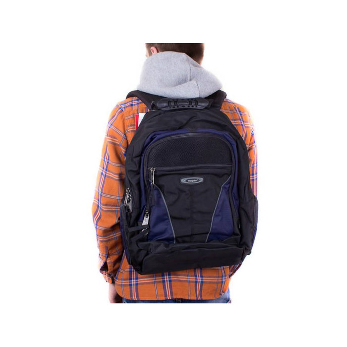 Достатньо однієї фотографії рюкзака, щоб зрозуміти всю його надійність. Щільний, добре тримає форму рюкзак буде відмінно виглядати навіть при частковій його наповненості. Місткі відділення і кишені продумані таким чином, щоб був задіяний кожний сантиметр. Лаконічний декор рюкзака сподобається людям, що мають більш консервативні погляди на моду. Рюкзак має кілька шарів різної щільності гнучкої спіненої набивки для поглинання зовнішніх ударів, поштовхів і струсів. На лицьовій стороні є прорізна кишеня на блискавці. Всередині рюкзака є: два автономні відділення, дві накладних кишені, дві кишені на блискавці, три відділення для кулькових ручок відділення для ноутбука з екраном до 15.4". По боках вироби є накладні кишені на блискавці для різних аксесуарів. Для зручності основні відділення рюкзака закриваються двосторонніми блискавками. На лицьовій стороні є вихід для навушників, так що тепер у Вас є можливість слухати музику в той час, як плеєр добре захищений в спеціальній кишені рюкзака. Матеріал: поліестер Cordura PU 1000D. Колір: темно-синій, чорний. Колір фурнітури: чорне срібло. Фурнітура: Duraflex - високоякісна пластикова фурнітура виробництва одного зі світових лідерів National Molding Corporation (США).