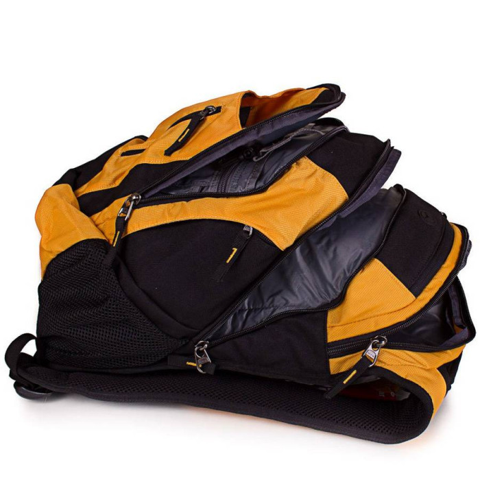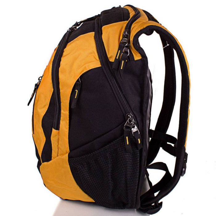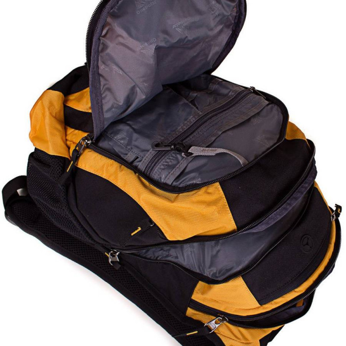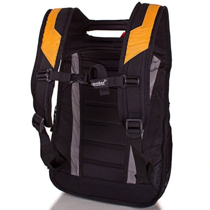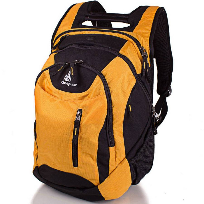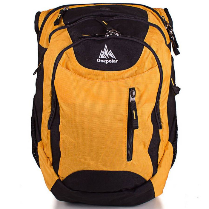 Тип конструкції: напівжорсткий рюкзак. Спинка рюкзака має спеціальну вставку з щільного, але при цьому гнучкого матеріалу. Вона відрізняється анатомічною формою (так звана "майка"). Центральна її частина ребриста, що значно покращує процес циркуляції повітря. Кількість основних відділень: 2. Всередині рюкзак має містку кишеню для плеєра або смартфона (з окремим вертикальним входом і застібкою-блискавкою). Одне з відділень призначений для зберігання і транспортування ноутбука. Кількість додаткових відділень: 1. Всередині нього знаходиться пластиковий карабін на нейлоновий стрічці, призначений для кріплення ключів, а також органайзер для різного роду дрібних предметів (включає дві великих кишені (накладної та прорізної на блискавці), чотири відділення для ручок, олівців або стилусів, кишенька для мобільного телефону або іншого портативного гаджета (закривається за допомогою клапана на липучці), накладної кишеня-сітка для записок та візиток). У верхній частині аксесуара розташований прогумований вихід для навушників. Виріб оснащений зручними накладними бічними кишенями на спеціальних стягуючих гумках. Кишені виготовлені з сітки. На лицьовій стороні рюкзака є один велика накладна кишеня на липучці. На зовнішній стінці цього кишені є ще одну прорізну кишеню на блискавці. Крім того рюкзак оснащений двома вертикальними прорізними кишенями на блискавці. Плечові лямки мають анатомічну форму. Вони забезпечені щільною подкладой з поропласту, а їх тильна сторона виконана з сітки 3D airmesh, яка не перешкоджає вільній циркуляції повітря. Довжина лямок може регулюватися за допомогою пластикових пряжок. Також виріб має зручну жорстку ручку, за допомогою якої аксесуар можна переносити в руці або повісити на гачок або вішалку. На лямках є грудна стяжка з еластичною вставкою, яка не тільки фіксує рюкзак, але і сприяє кращому розподілу ваги. Висоту і ширину грудної стяжки можна регулювати. Виріб ідеально підходить для використання в якості міського рюкзака, а також для нетривалих поїздок. Матеріал: Polyester Oxford. Колір: жовтий (гарячий відтінок, ближче до помаранчевого), чорний. Колір металевої фурнітури: чорне срібло. Аксесуар оснащений міцною фурнітурою японської фірми YKK (фастекси, рамки, фіксатори, карабіни тощо). Деталі виготовлені з поліацетали (POM). Матеріал володіє низьким коефіцієнтом тертя, високу втомної міцністю, поєднує високу твердість і стійкість до ударних навантажень (у тому числі при низьких температурах). Зовнішні розміри рюкзака: 32*46*22 см. Об'єм: 30 л. Вага: 850 р. Усі відділення закриваються за допомогою блискавок з двома собачками. Виріб упаковано в поліетиленовий пакет. Документи формату А4 поміщаються в рюкзак. Країна походження торгової марки Onepolar - Китай. Гарантія: 2 роки.