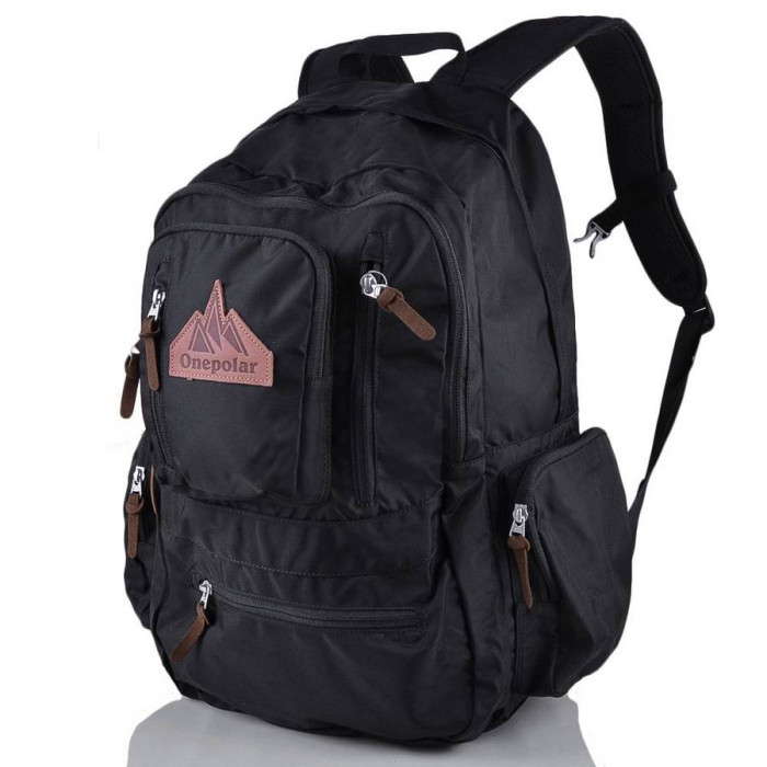Рюкзак має кілька шарів різної щільності гнучкої спіненої набивки для поглинання зовнішніх ударів, поштовхів і струсів. На лицьовій стороні рюкзака є три прорізні кишені на блискавці і одну накладну кишеню на блискавці. Всередині рюкзака є: два автономні відділення, дві накладних кишені, два відділення для кулькових ручок, одна кишеня на блискавці, карабін для ключів та відділення для ноутбука з екраном до 15.4". З боків рюкзака є накладні кишені на блискавці. Для зручності всі відділення рюкзака закриваються двосторонніми блискавками. Матеріал: поліестер, Polyester Oxford 600D PU. Колір: чорний. Колір фурнітури: срібло. Фурнітура: Duraflex - високоякісна пластикова фурнітура виробництва одного зі світових лідерів National Molding Corporation (США). Зовнішні розміри рюкзака: 38*49*19 см. Об'єм: 28 л. Документи формату А4 поміщаються в рюкзак. Рюкзак упакований в поліетиленовий пакет. Гарантія: 2 роки. Країна походження торгової марки: Onepolar (Китай).