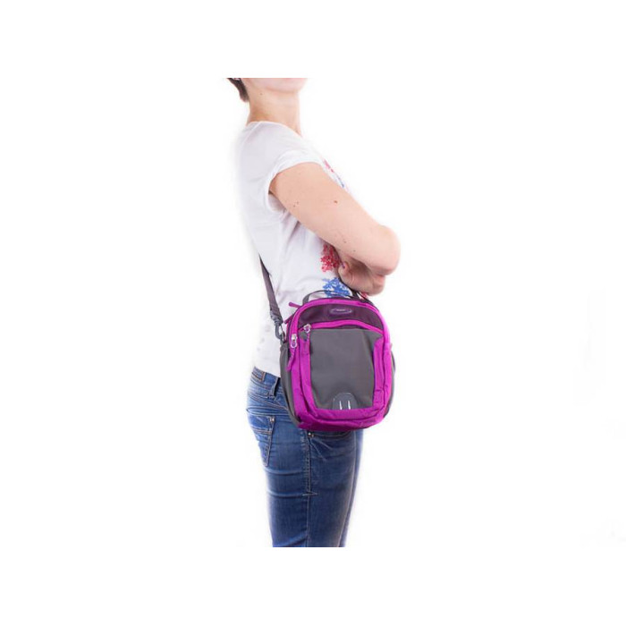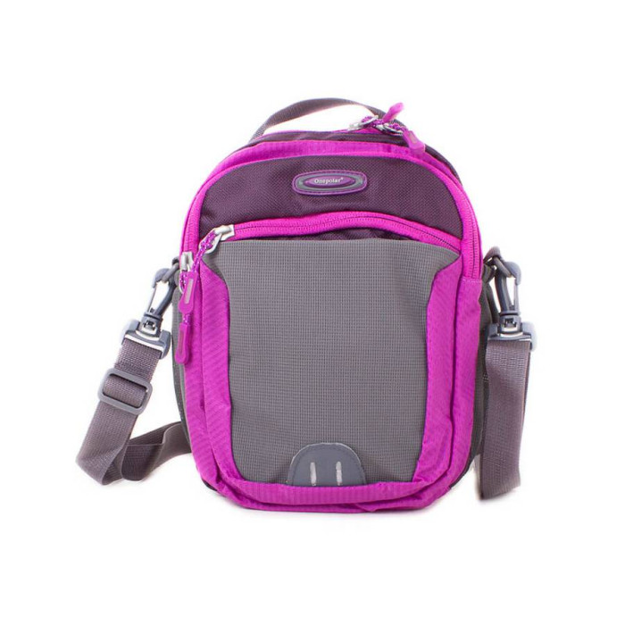 На лицьовій стороні сумки є прорізна кишеня на блискавці і накладна кишенька без застібки. По боках вироби є накладні кишеньки на гумці для різних аксесуарів. Всередині сумки є: два автономних відділення на блискавках, дві накладних кишені, одна кишеня на блискавці і карабін для ключів. Довжина ручки для носіння сумки в руці становить 14 см, а висота від крайньої точки до ручки сумки - 3 см. Довжина знімного ременя для носіння сумки через плече регулюється і становить 92-165 см, а висота від крайньої точки ременя до сумки - 36-75 см. Підкладка виготовлена з сірої тканини. Матеріал: поліестер. Колір: бузковий, сірий. Колір фурнітури: срібло. Фурнітура: Duraflex - високоякісна пластикова фурнітура виробництва одного зі світових лідерів National Molding Corporation (США). Зовнішні розміри сумки: 26*23*12 см. Об'єм: 8 л. Документи формату А4 не поміщаються в сумку. Сумка упакована в поліетиленовий пакет. Гарантія: 2 роки. Країна походження торгової марки: Onepolar (Китай).