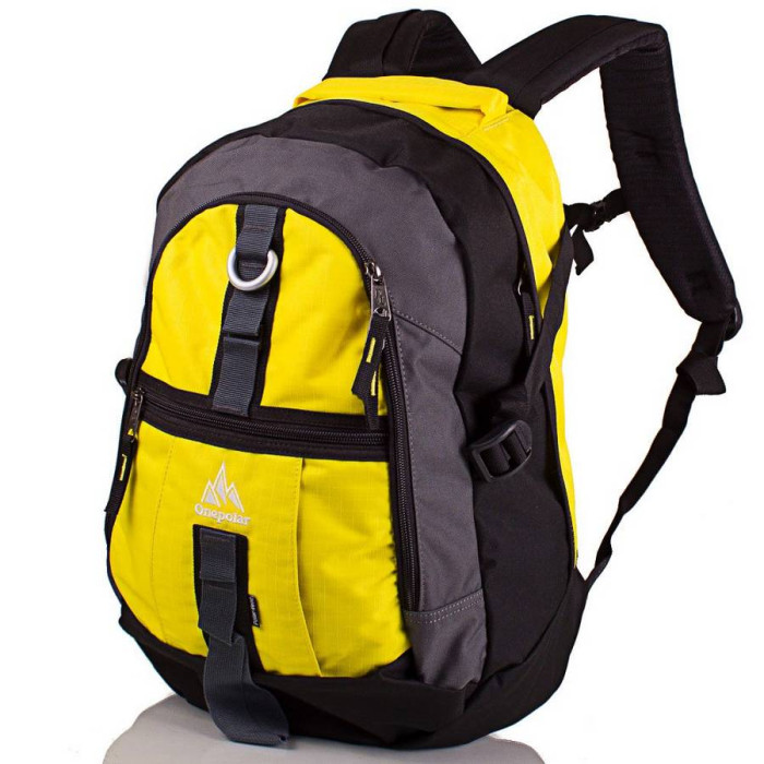 Тип конструкції: м'який рюкзак. Спинка рюкзака прошита особливим чином, що значно покращує процес вентиляції спини. Кількість основних відділень: 1. Всередині рюкзак має спеціальну накладну кишеню на блискавці для плеєра або смартфону, а також велика накладна кишеня. Кількість додаткових відділень: 1. Всередині нього знаходиться органайзер для різного роду дрібниць (включає велика накладна кишеня, два кармашка поменше (накладної та прорізної на блискавці), два відділення для ручок, олівців або стилусів). На лицьовій частині рюкзака є місткий прорізна кишеня на блискавці, а також кріплення і підвіси для різного спорядження. Виріб має компресійні стяжки (2 бічні), які служать не тільки для регулювання об'єму рюкзака, але і для кріплення/фіксації різних предметів (наприклад, каремат або килимка для йоги). Плечові лямки мають анатомічну форму. Вони забезпечені щільною подкладой з поропласту, а їх тильна сторона виконана з сітки, яка не перешкоджає вільній циркуляції повітря. Довжина лямок може регулюватися за допомогою пластикових пряжок. Також виріб має зручну ручку, за допомогою якої аксесуар можна переносити в руці або повісити на гачок або вішалку. На лямках є грудна стяжка, яка не тільки фіксує рюкзак, але і сприяє кращому розподілу ваги. Висоту і ширину грудної стяжки можна регулювати. Виріб можна використовувати в якості міського рюкзака, для активного відпочинку, для нетривалих поїздок та походів вихідного дня. Матеріал: Polyester Oxford. Колір: жовтий, сірий, чорний. Колір металевої фурнітури: чорне срібло. Аксесуар оснащений міцною фурнітурою японської фірми YKK (фастекси, рамки, фіксатори, карабіни тощо). Деталі виготовлені з поліацетали (POM). Матеріал володіє низьким коефіцієнтом тертя, високу втомної міцністю, поєднує високу твердість і стійкість до ударних навантажень (у тому числі при низьких температурах). Зовнішні розміри рюкзака: 28*45*16 см. Об'єм: 25 л. Вага: 560 р. Всі відділення рюкзака закриваються за допомогою блискавки з двома собачками. Виріб упаковано в поліетиленовий пакет. Документи формату А4 поміщаються в рюкзак. Країна походження торгової марки Onepolar - Китай. Гарантія: 2 роки.