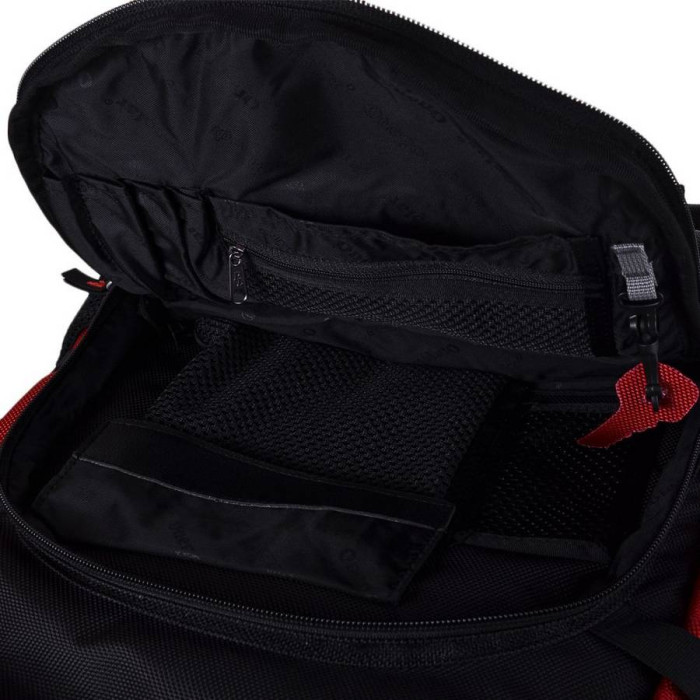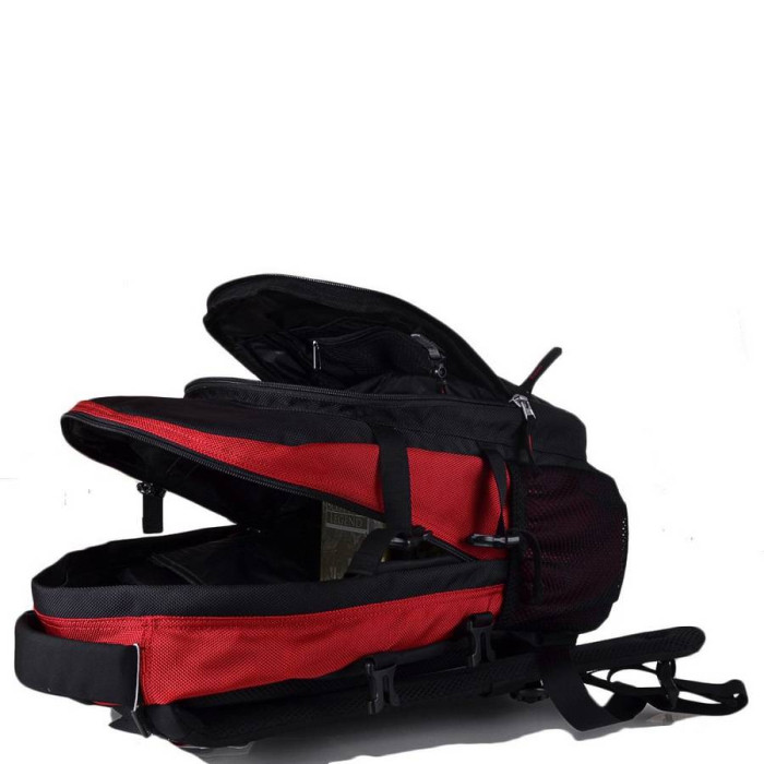 Рюкзак ONEPOLAR W-939 володіє вишуканою колірною гамою чорно-червоних відтінків, які гармонійно обтікають за квадратно-овальної форми. По цих же вигинах рюкзака оформлена і система застібок з подвійними блискавками, але при цьому вона посилена бічними фіксаторами, які при затягуванні забезпечують нерухомість ноутбука, який знаходиться всередині рюкзака. Також в бічних областях є накладні сітчасті кишені для води, а на лицьовій стороні рюкзака розміщений великий кишеня для документів і подовжений кишеня для комфортного транспортування зарядного пристрою для ноутбука. Рюкзак дуже надійний і комфортний у використанні, а при дбайливому до нього відношенні буде служити вам кілька років.