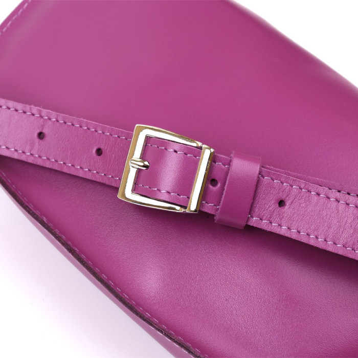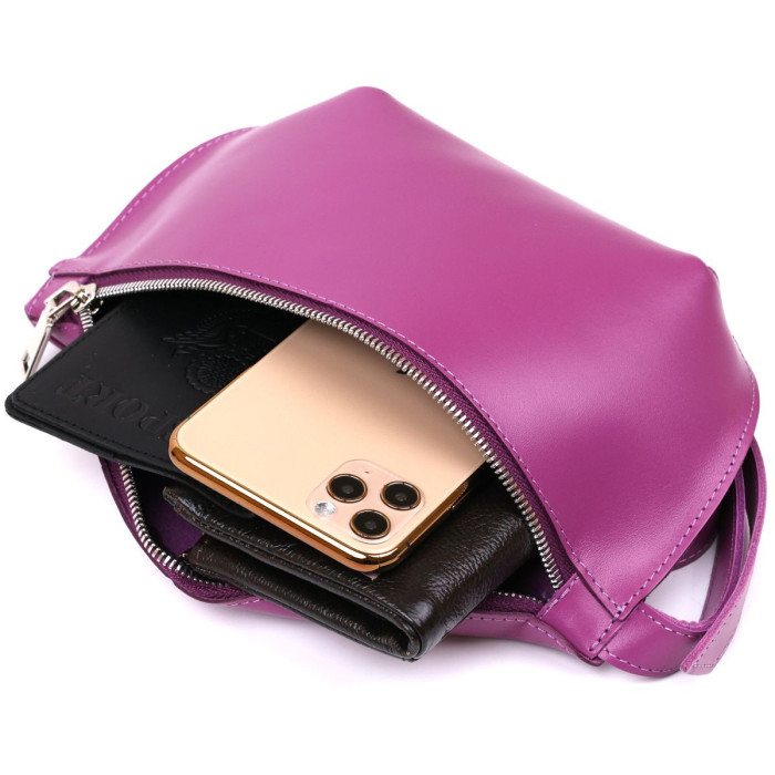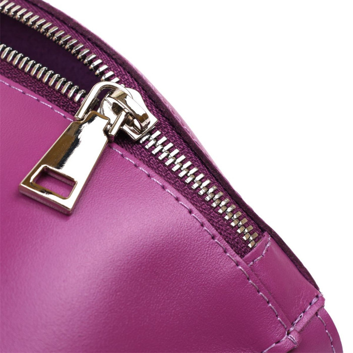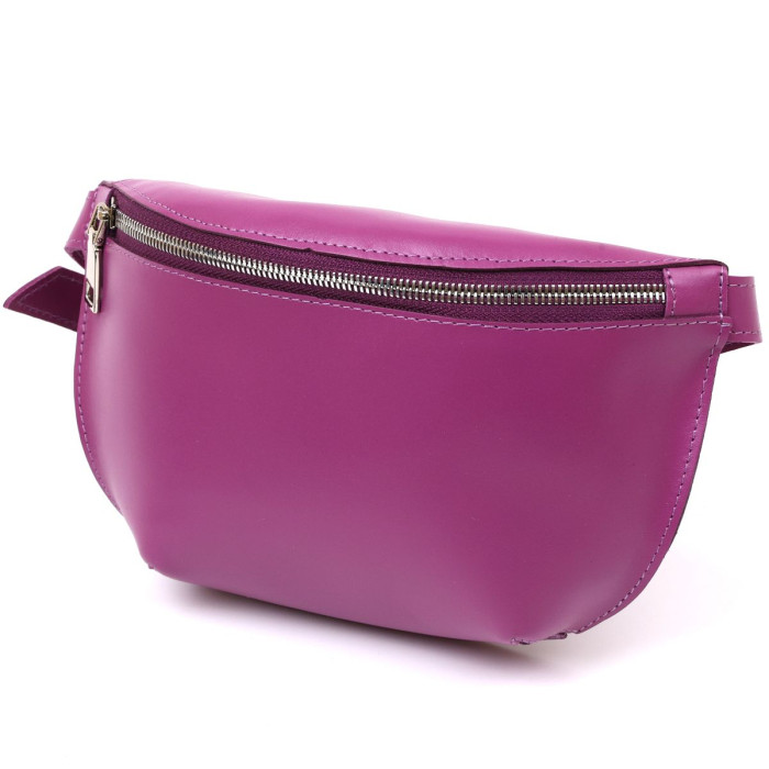 Яскрава красива сумка на пояс від українського виробника в соковитому фіолетовому кольорі. Виконано модель із натуральної висококласної шкіри з високими показниками міцності. Має одне просторе відділення, яке закривається на надійну блискавку срібного кольору. Шкіряний ремінець можна регулювати за довжиною.