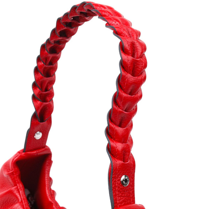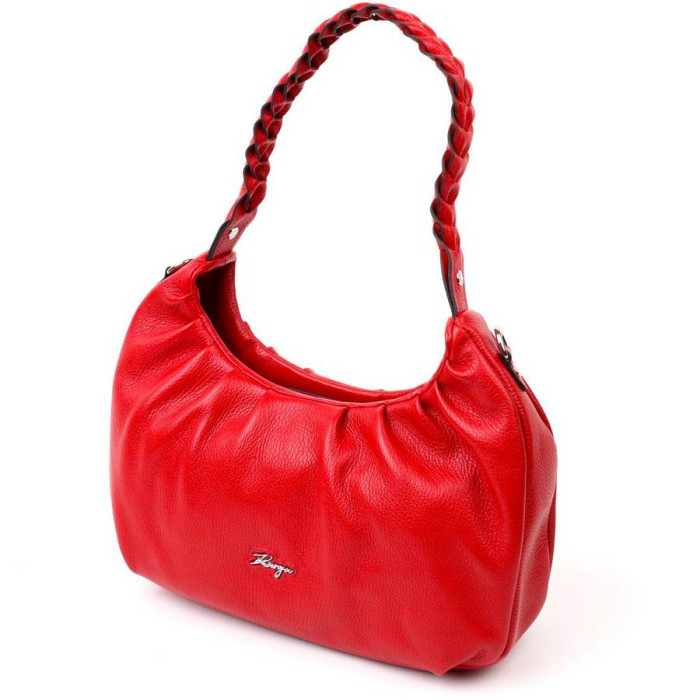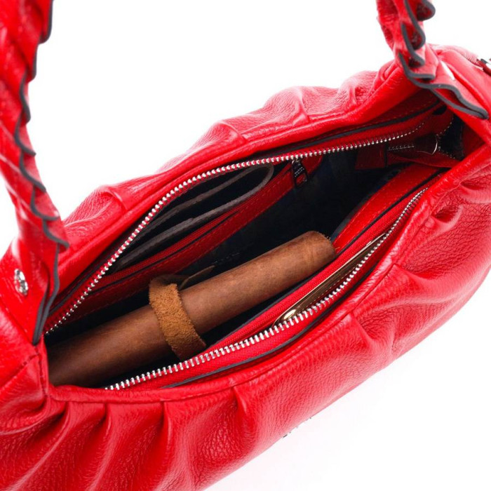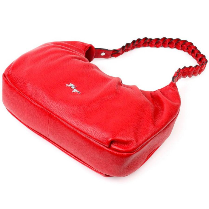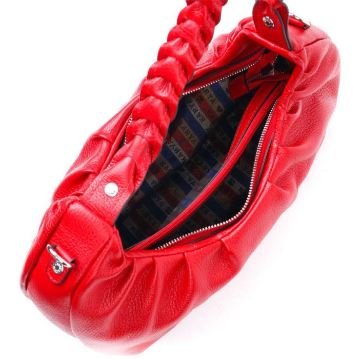 Яскрава сумка-багет середнього розміру з натуральної великозернистої шкіри червоного кольору. Виріб має надійну плетену ручку для перенесення в руці, а також знімний шкіряний і регульований по довжині, плечовий ремінь. Сумка функціональна та зручна в експлуатації, виріб має якісну фурнітуру сріблястого кольору та міцну підкладку. Аксесуар упакований у фірмовий текстильний мішок Karya. Сумка з натуральної шкіри завжди буде чудовим подарунком будь-якій жінці.