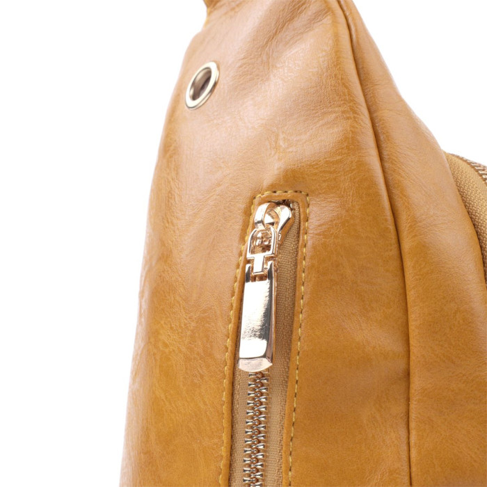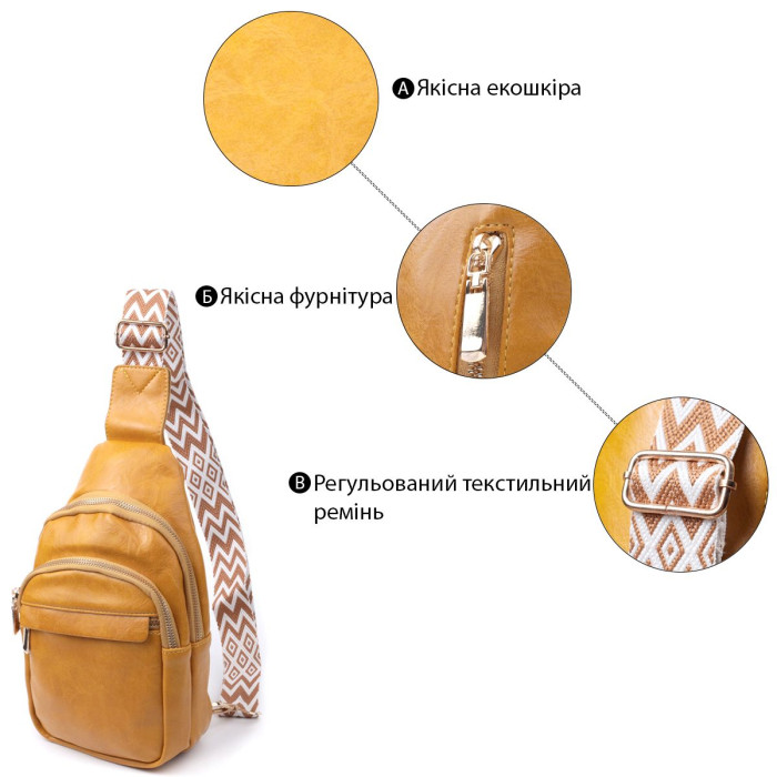 Функціональна слінг сумка для жінок з гладкої екошкіри. Дана модель складається з одного основного відділення, яке закривається на блискавку і в якому знаходиться кишеня на блискавці і три кишені для кредитних карток усередині, а також трьох кишень зовні та одного отвору для кабелю або навушників, що дуже зручно в сучасному світі. Акцентом даної моделі є зручний регульований плечовий ремінець у етнічному стилі, що дуже модно вже кілька сезонів. Екошкіра - високоякісна альтернатива натуральному матеріалу, яка дуже стійка до тертя, до низьких температур, відмінно носиться на відміну від інших штучних матеріалів, а також має гіпоалергенний склад на відміну від натуральної шкіри.