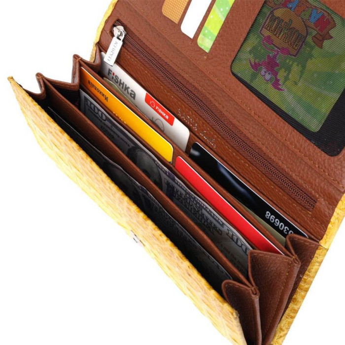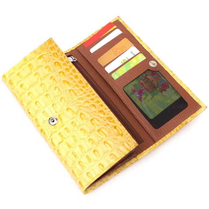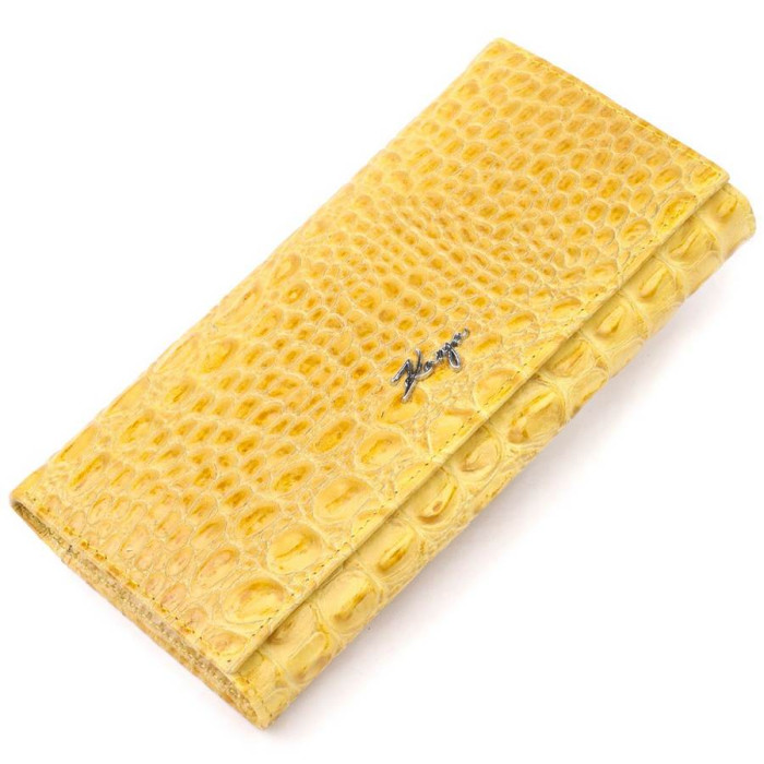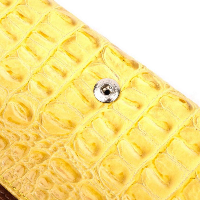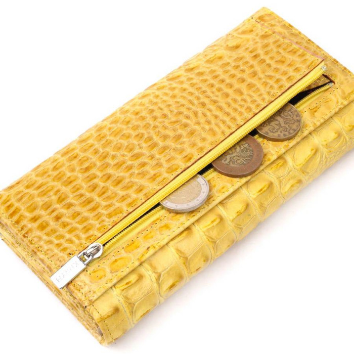 Цікавий жіночий гаманець із натуральної лакованої шкіри, з тисненням під крокодила. Складається аксесуар навпіл, закривається клапаном на кнопку. Якісна фурнітура доповнює та прикрашає виріб. Такий гаманець з натуральної шкіри - це ідеальний варіант на кожен день для тих, хто цінує якість, зручність та комфорт, а також чудово доповнюватиме Ваш повсякденний образ. Запакований аксесуар у фірмову коробку та пакет бренду. Вироби з натуральної шкіри завжди будуть чудовим подарунком для близької людини.