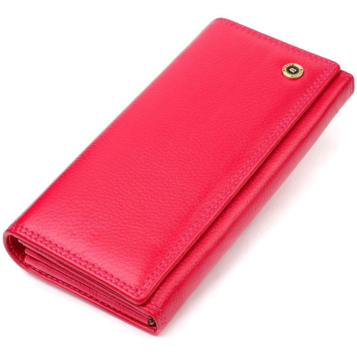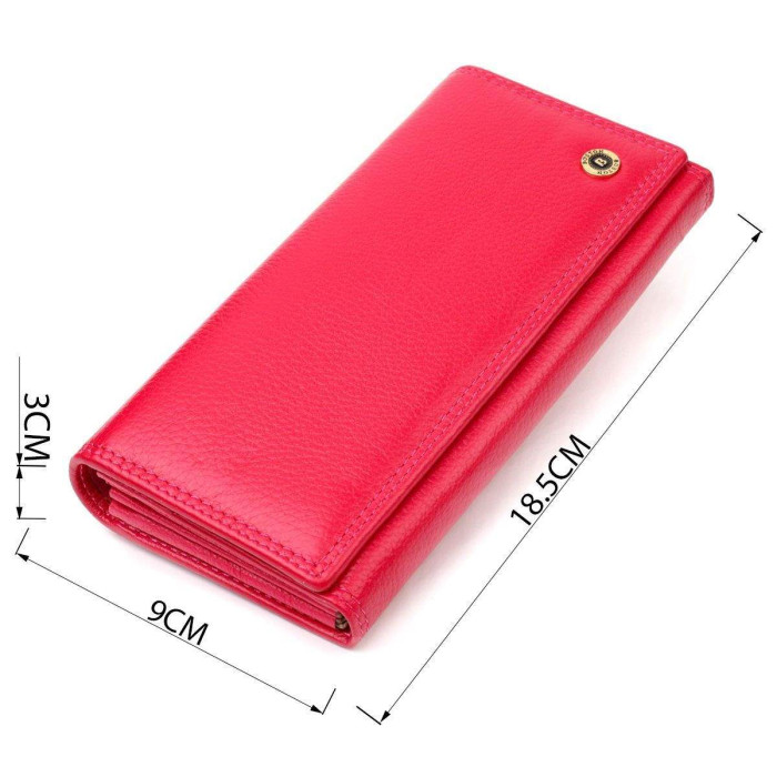 Стильний жіночий гаманець із натуральної якісної шкіри, у яскравому рожевому кольорі. Аксесуар має стильний дизайн та практичний функціонал. Фурнітура надійна та оформлена в золотистому відтінку, доповнюючи основний колір. Усередині достатньо місця для зручного розташування паперових купюр, банківських, дисконтних карток, візиток та документів, адже відділення просторі та виконані з текстилю. Гаманець упакований у фірмову коробку від виробника.