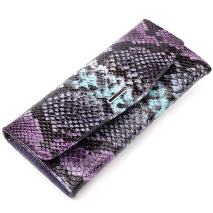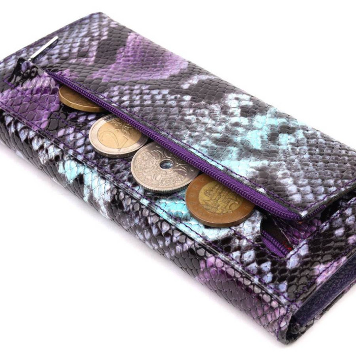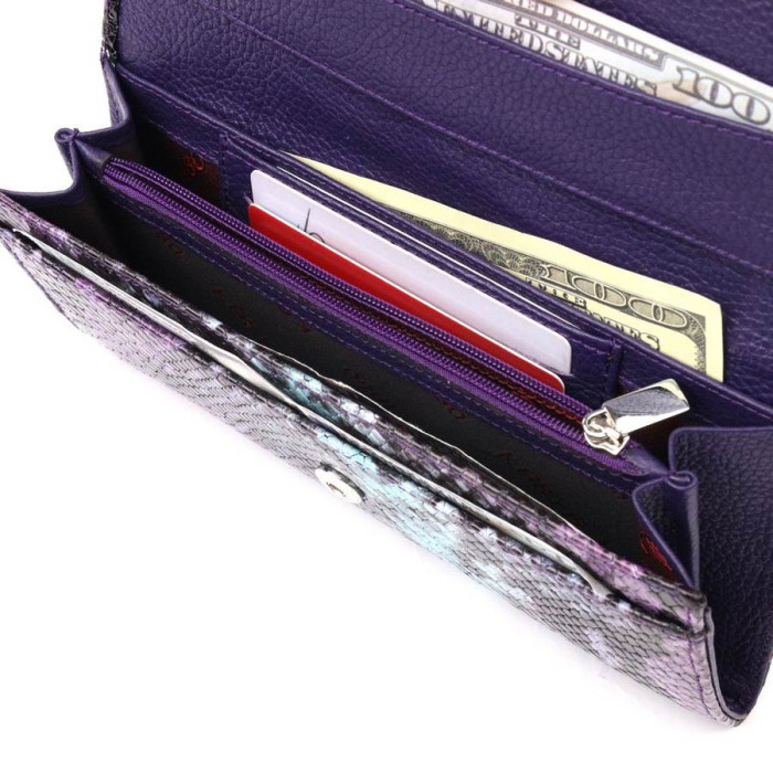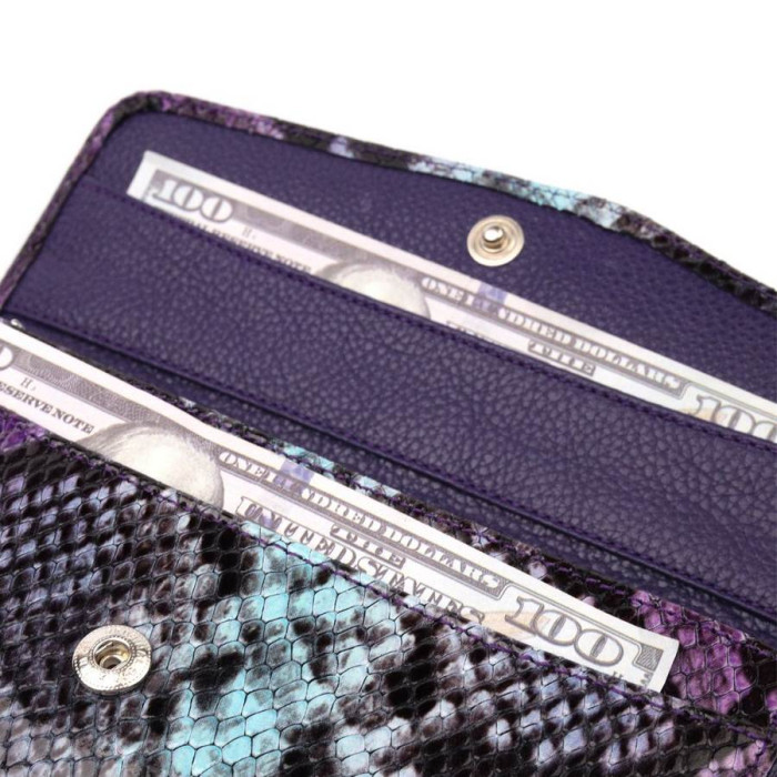 Гарний жіночий гаманець з натуральної шкіри, з тисненням під рептилію, в фіолетовому кольорі. Складається аксесуар навпіл, закривається клапаном на кнопку. Якісна фурнітура доповнює та прикрашає виріб. Такий гаманець з натуральної шкіри - це ідеальний варіант на кожен день для тих, хто цінує якість, зручність та комфорт, а також чудово доповнюватиме Ваш повсякденний образ. Запакований аксесуар у фірмову коробку та пакет бренду. Вироби з натуральної шкіри завжди будуть чудовим подарунком для близької людини.