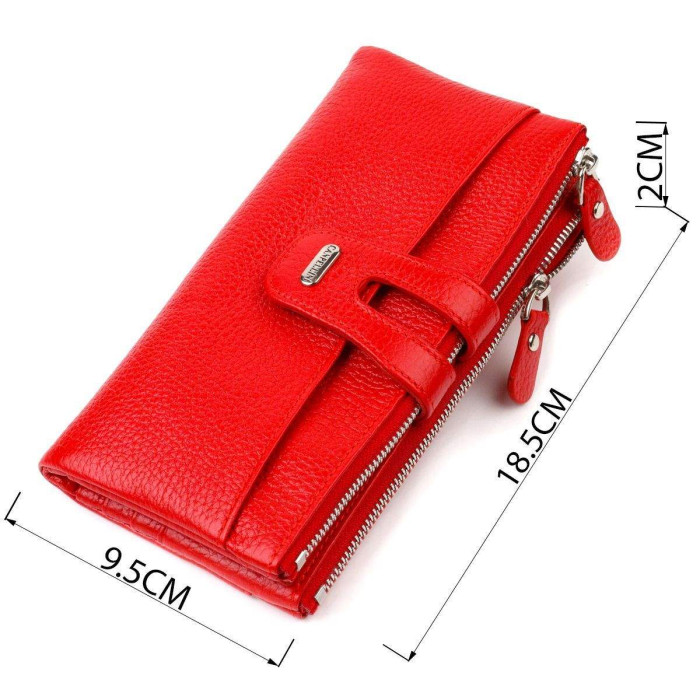 Місткий жіночий гаманець горизонтального типу із натуральної шкіри. Аксесуар має три відділення для купюр, дев'ятнадцять осередків для карток (одна під сіточкою), кишеня під сіточкою на всю довжину, дві прилеглі кишені зовні і дві кишені на блискавках на всю довжину. Закривається аксесуар навпіл хлястиком на кнопку. Купуючи шкіряний аксесуар цієї фірми собі або на подарунок, будьте певні, що він радуватиме око не один рік.
