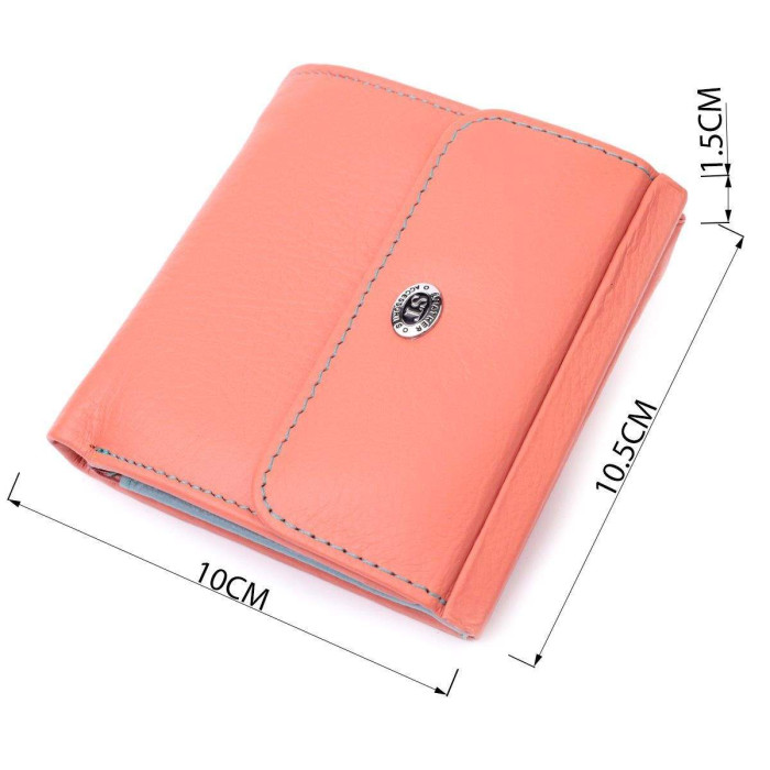 Неординарне кольорове портмоне для жінок середнього розміру із натуральної шкіри найвищої якості. Акцентом цього гаманця є колір, точніше кілька кольорів – він помаранчевого кольору зовні та багатобарвний усередині. Аксесуар складається з двох містких відділень для купюр, кишені на блискавці, чотирьох осередків для карт, прихованої кишені, прозорої кишені та кишені для монет. Зовні виріб прошитий рівним рядком бірюзового кольору по краю і прикрашений металевим логотипом компанії виробника, який розміщений вгорі посередині. Портмоне доповнено надійною фурнітурою та міцною підкладкою. Укомплектований гаманець у фірмову картонну коробку білого кольору.