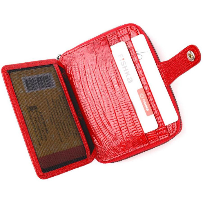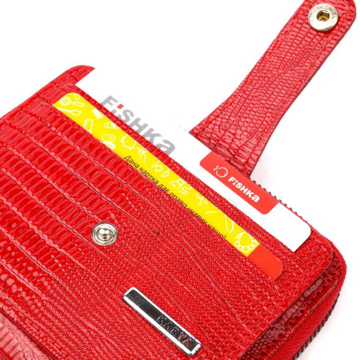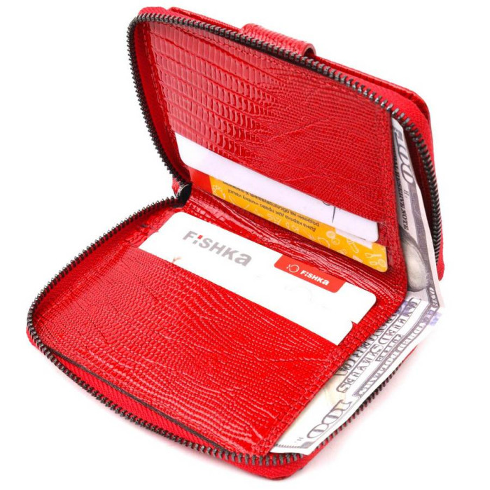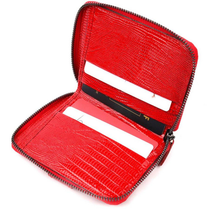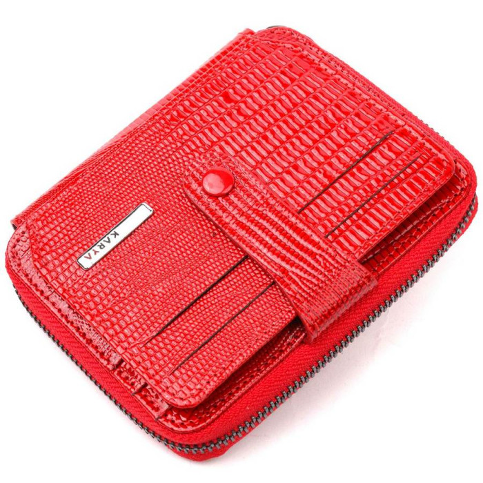 Яскравий гаманець-картхолдер з натуральної лакованої фактурної шкіри в червоному кольорі. Виріб закривається на блискавку (основне відділення) і на хлястик з кнопкою (бічне відділення). На лицьовій стороні у вигляді декору розташований металевий логотип виробника. Аксесуар упакований у фірмову коробочку. Вироби з натуральної шкіри завжди будуть чудовим подарунком для близької людини.