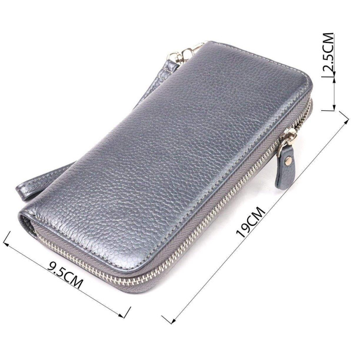Мерехтливий жіночий гаманець з натуральної шкіри з тисненням під крокодила. Аксесуар має три основні відділення, в які поміщаються купюри всіх номіналів, дві перегородки, одна з них на блискавці, вісім кишень для карток, дві прилеглі кишені та знімний кистьовий ремінь. Закривається аксесуар на блискавку. Відмінний аксесуар, надійного виробника, який прослужить дуже довго.