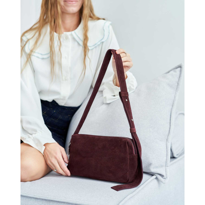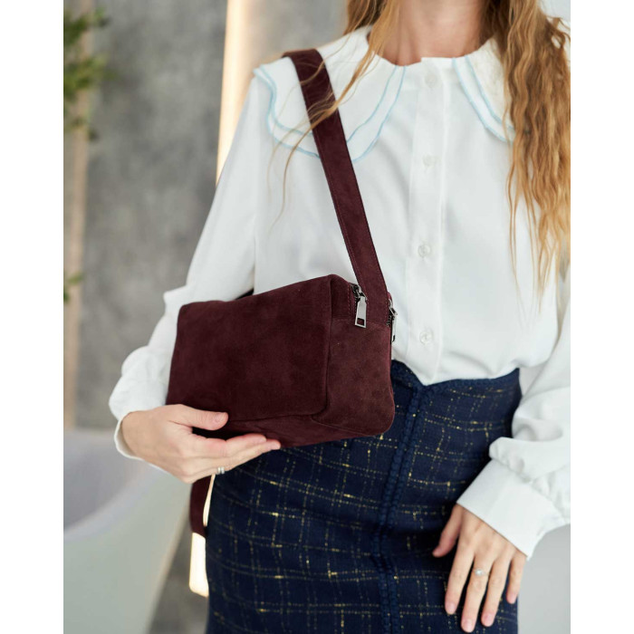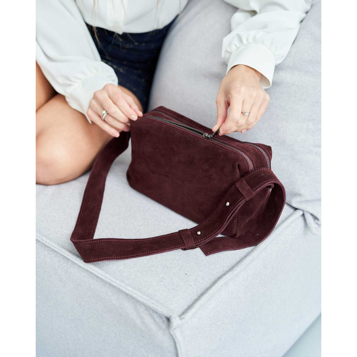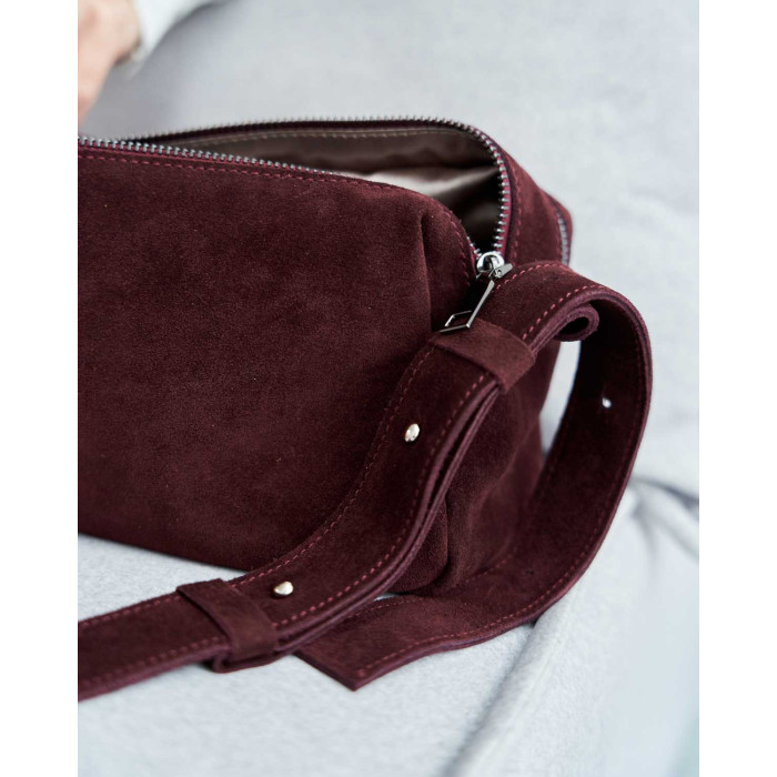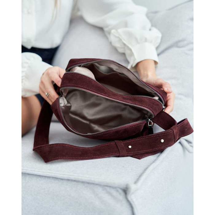 Замшева жіноча сумка К74757 від виробника «Welassie» Україна, колір бургунді, матеріал натуральна замша. Сумка на два відділення, відкривається за допомогою блискавки. Усередині сумка має одну відкриту кишеню і кишеню на застібці.