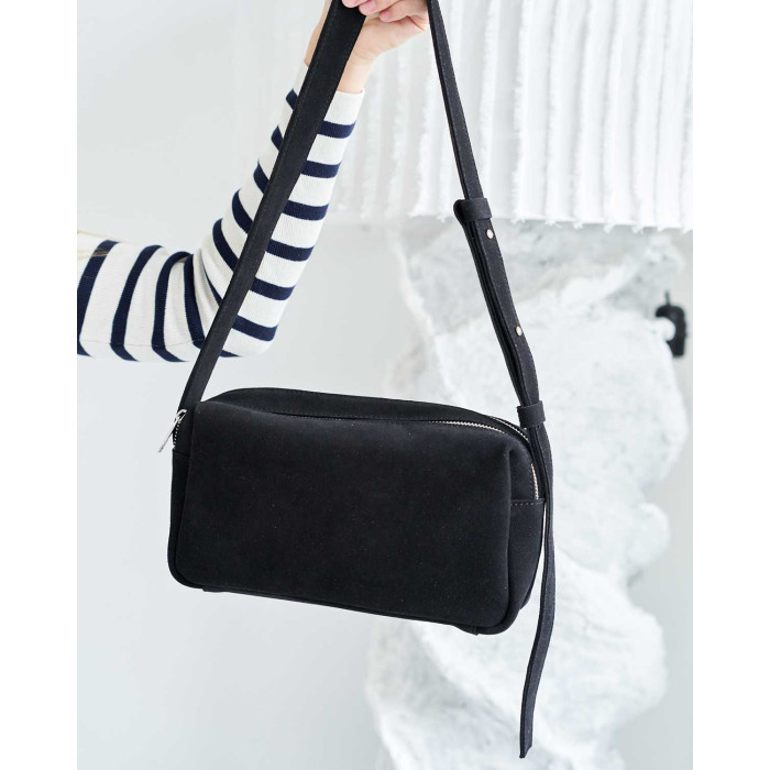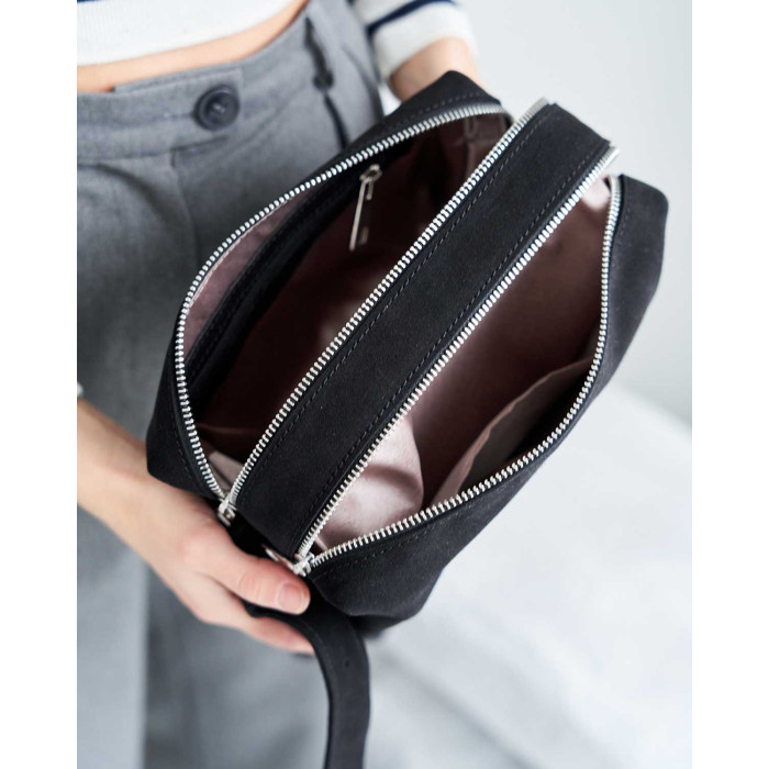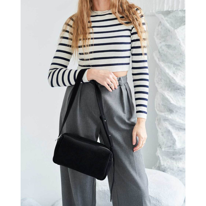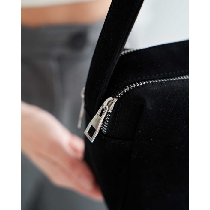 Замшева жіноча сумка К74754 від виробника «Welassie» Україна, колір чорний, матеріал натуральна замша. Сумка на два відділення, відкривається за допомогою блискавки. Усередині сумка має одну відкриту кишеню і кишеню на застібці.