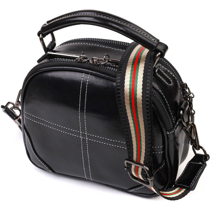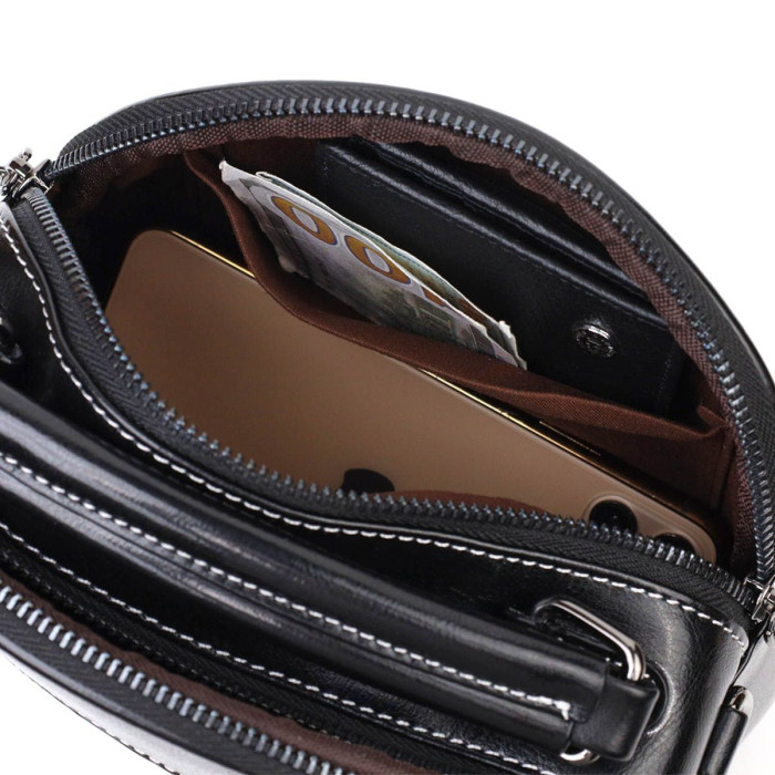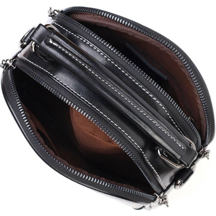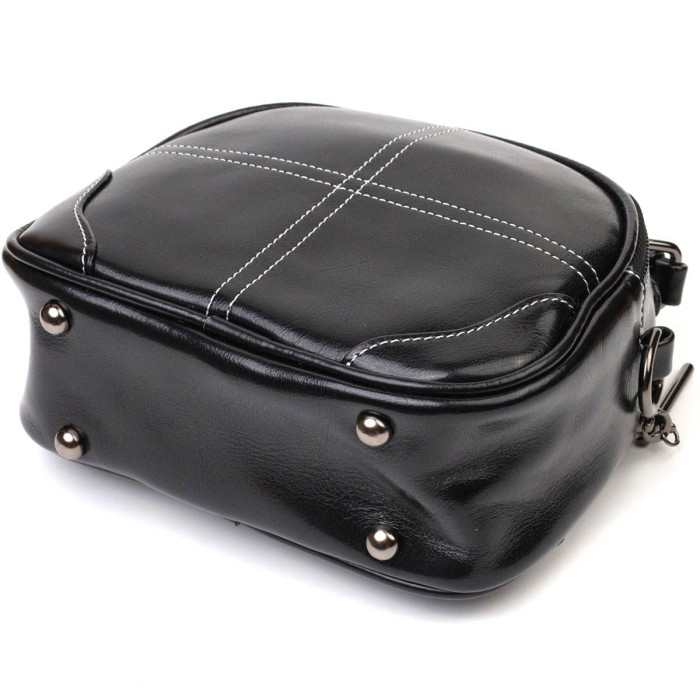 Стильна каркасна сумка із натуральної шкіри високої якості. Виріб дуже зручний, можна носити на плечі, через плече, в руці. Модель доповнена фурнітурою кольору темного срібла, а також прошита білою строчкою для декору. Аксесуар має два основні відділення на блискавках, в яких по кишеньці - одна на блискавці та одна відкритого типу, а також кишеня на блискавці зовні, на тильній стороні. Модель закривається на блискавку.