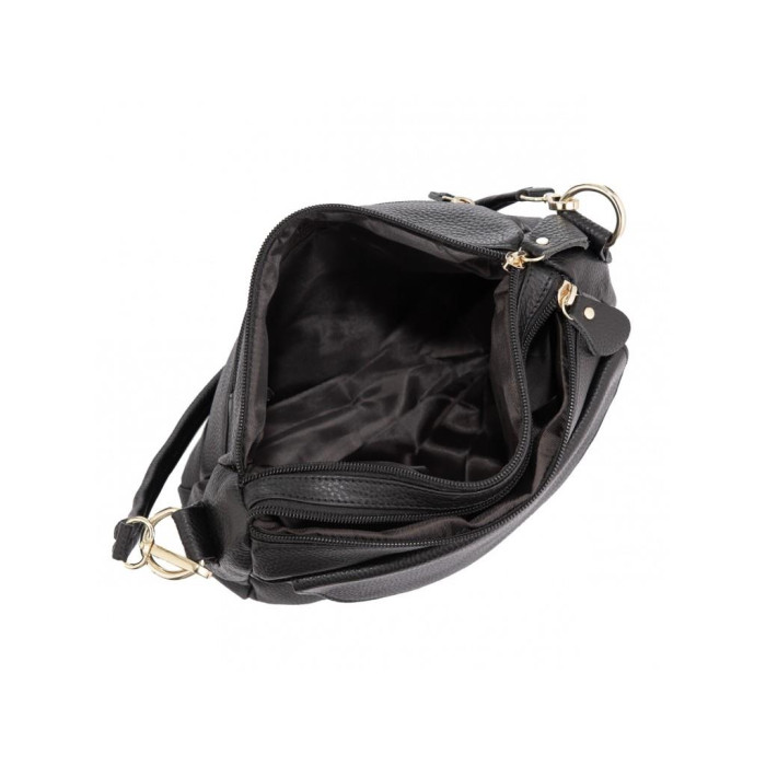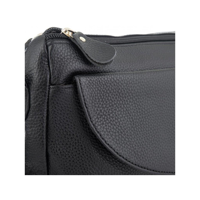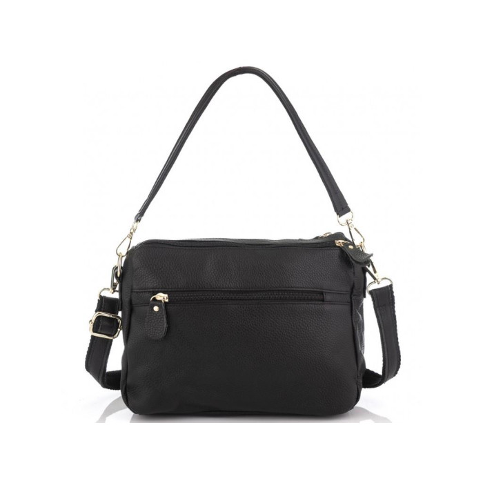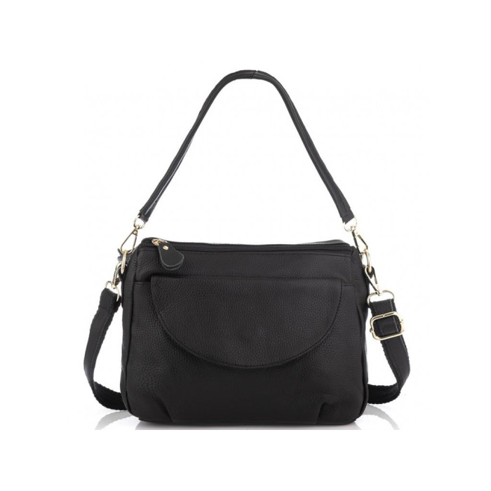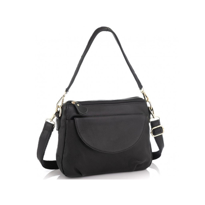 Маленька, чорна класична жіноча сумка в чорному кольорі. Вона має золотисту надійну фурнітуру, ремінь через плече який регулюється по довжині, а також додаткову шкіряну ручку - 45 см. Жіноча шкіряна сумка складається з двох основних відділень, додаткової кишені на магнітній кнопці з лицьового боку і кишені на блискавці з тильної. Усередині сумки є маленька кишеня для дрібниць.
