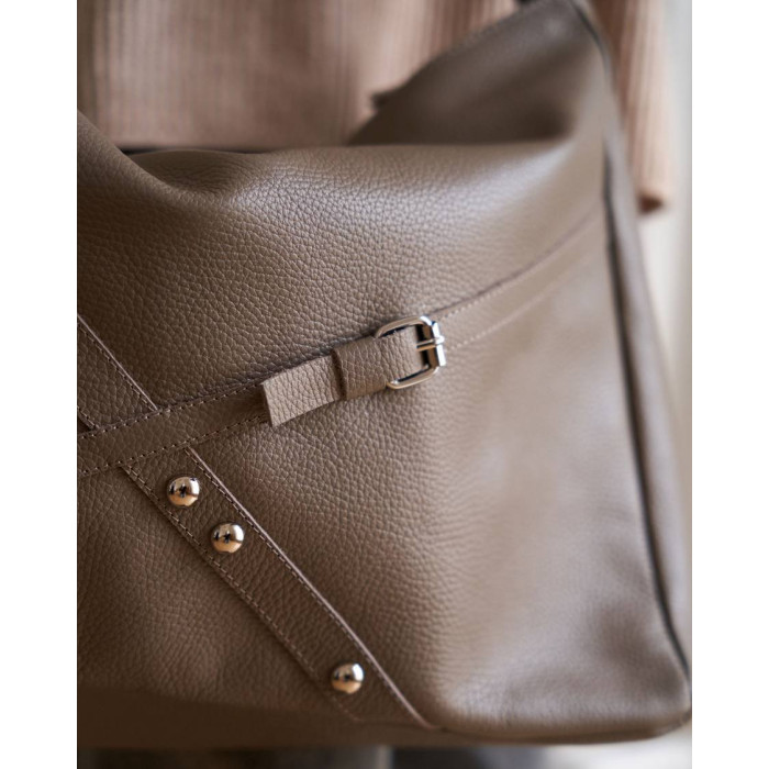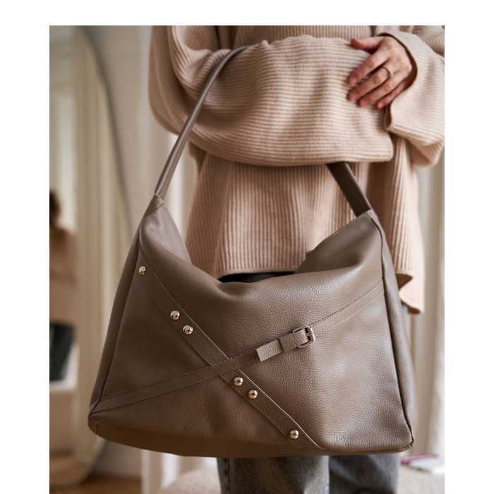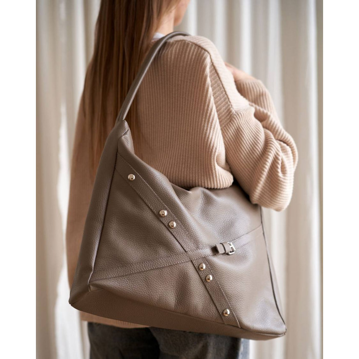 Жіноча стильна сумка K70429 виробництва Україна, колір кавовий, матеріал сумки натуральна шкіра, флотар. Сумка відкривається за допомогою блискавки. Усередині сумка має одну відкриту кишеню і на змійці. Сумка має ручку 20 см (від верху сумки).