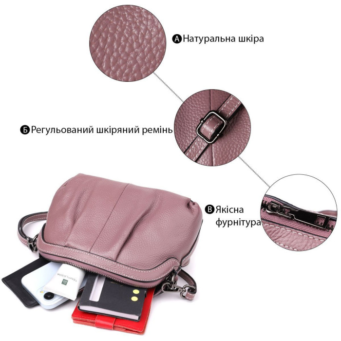 Пурпурна шкіряна сумка з драпіруванням - це аксесуар з характером: вишуканий, помітний і водночас практичний. Ідеально підійде як для буднів, так і для особливих випадків, коли хочеться виглядати особливо ефектно.