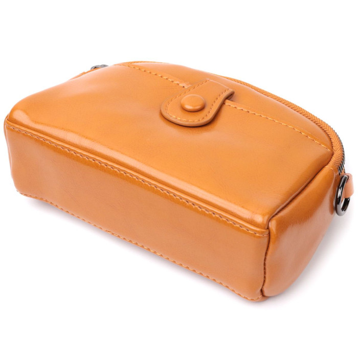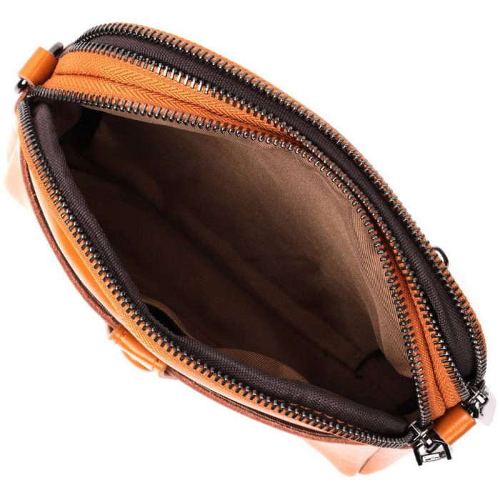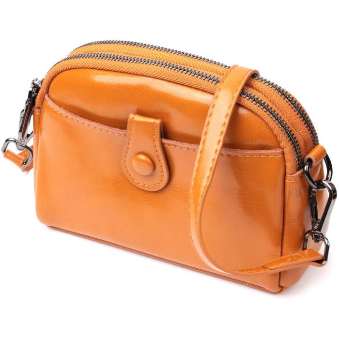 Яскрава маленька жіноча сумка на два автономні відділення з натуральної глянсової шкіри, яка невибаглива у догляді та довго носиться. Аксесуар складається з двох основних відділень, потайної кишені на блискавці, кишені відкритого типу, кишені на лицьовій стороні, що закривається хлястиком на магніт та кишені на блискавці зовні, на тильній стороні. Носити сумку можна в руках, на плечі і через плече, для цього є шкіряний ремінь, що знімається. У виробі використано якісну фурнітуру кольору темного срібла. Універсальний варіант сумки як на вечір так і як сумочка на кожен день.