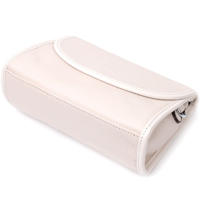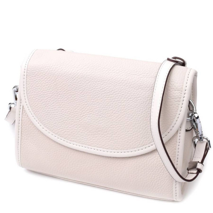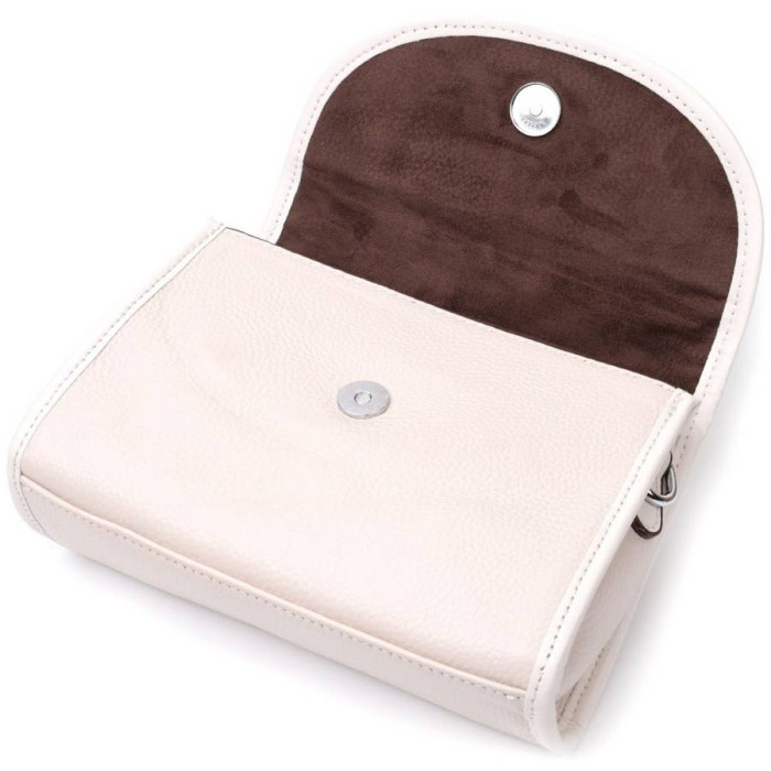 Ніжна маленька сумочка яка закривається на блискавку та стильний напівкруглий клапан на магніті. Виріб пошитий з якісної натуральної м'якої шкіри, яка довго носиться і не втрачає свого первісного вигляду. Аксесуар складається з основного відділення та потайної кишені на блискавці. Носити сумку можна під рукою, на плечі і через плече, для цього є шкіряний ремінь, що знімається регульований. У виробі використано якісну фурнітуру срібного кольору. Універсальний варіант сумки, який підійде для вечора, а також відмінно підійде на кожен день.