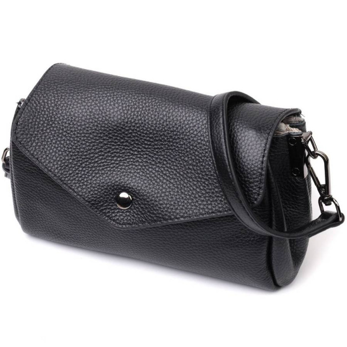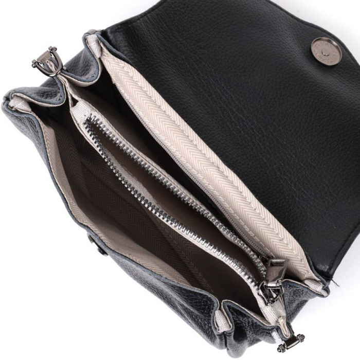 Компактна жіноча сумка з м'якої добротної шкіри, яка чудово носиться і не втрачає свого первісного вигляду. Аксесуар складається з одного основного відділення в якому всередині дві кишені на блискавках. Носити сумку можна в руках, на плечі і через плече, для цього є шкіряний ремінь, що знімається. У виробі використано якісну фурнітуру кольору темного срібла. Універсальний варіант сумки як на вечір так і як сумочка на кожен день.