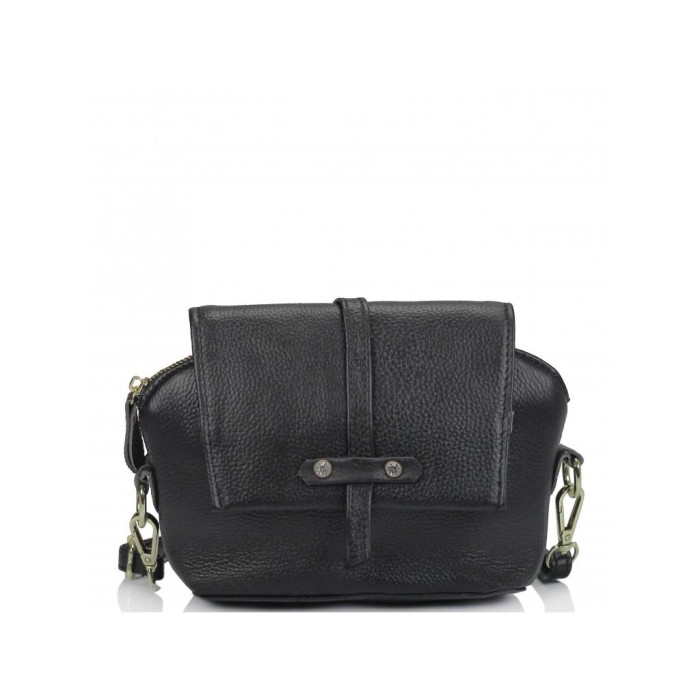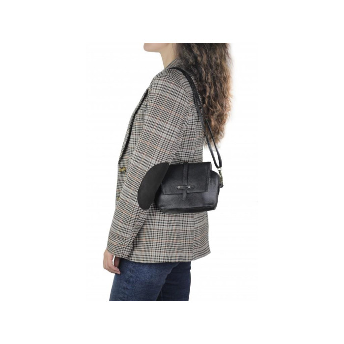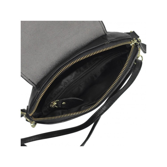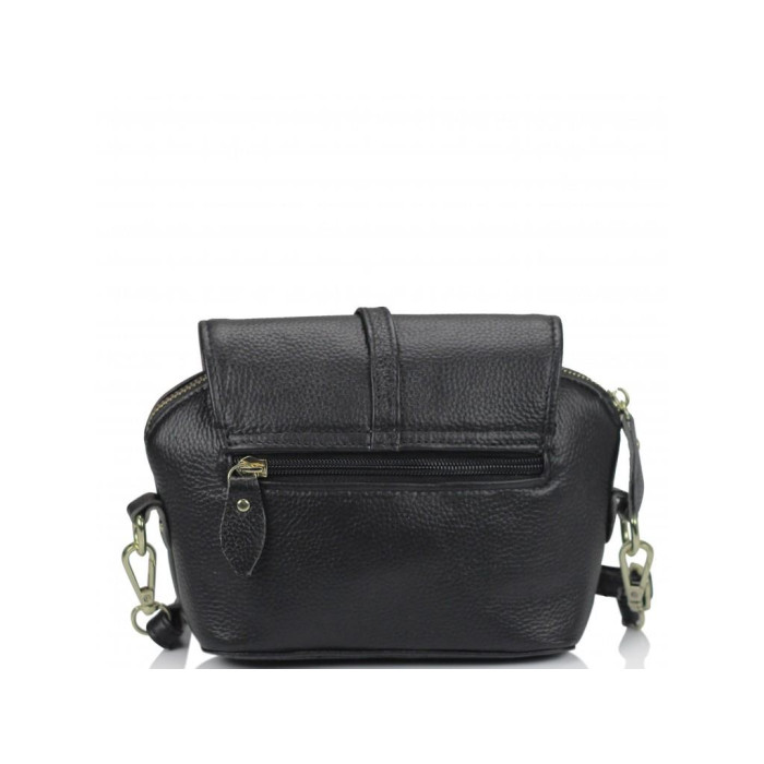 Шкіряна маленька сумка через плече в чорному кольорі. Сумка має довгий ремінь, який регулюється по довжині. Сумка жіноча оснащена одним основним відділенням, яке накривається клапаном на магнітній кнопці. З тильного боку також є кишеня на блискавці. Усередині сумки є маленькі кишені для дрібних речей.