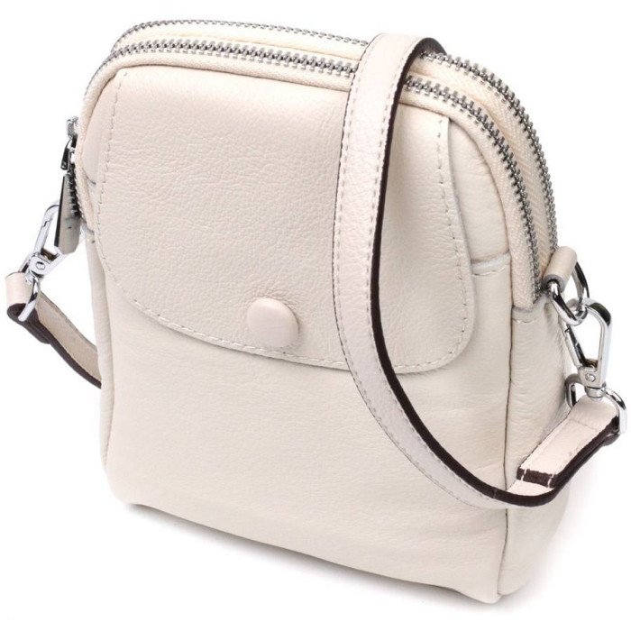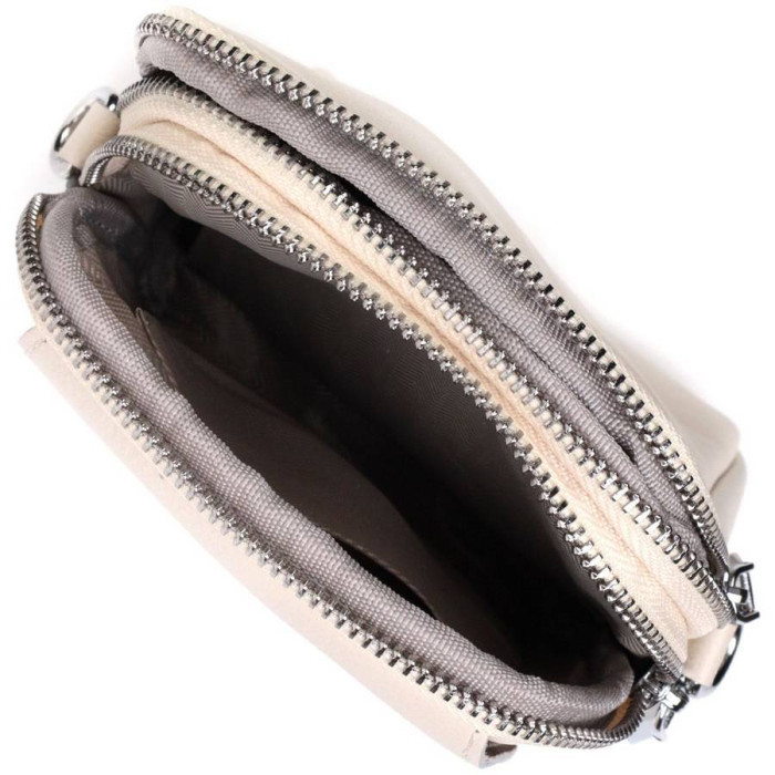 Цікава сумка трапецієподібної форми для стильних та незалежних жінок. Виріб пошитий з якісної натуральної м'якої шкіри, яка довго носиться і не втрачає свого первісного вигляду. На лицьовій стороні розташована накладна кишеня, що закривається клапаном на магніт. Аксесуар складається з двох відділень, що закриваються на блискавки, всередині яких знаходиться потайна кишеня на блискавці та кишеня відкритого типу. Носити сумку можна на плечі і через плече, для цього є шкіряний ремінь, що знімається. У виробі використано якісну фурнітуру срібного кольору. Універсальний варіант сумки як на вечір так і як сумочка на кожен день.