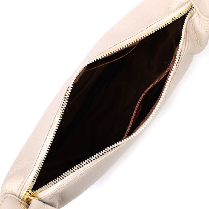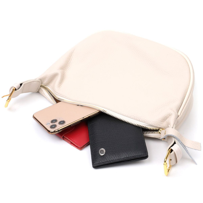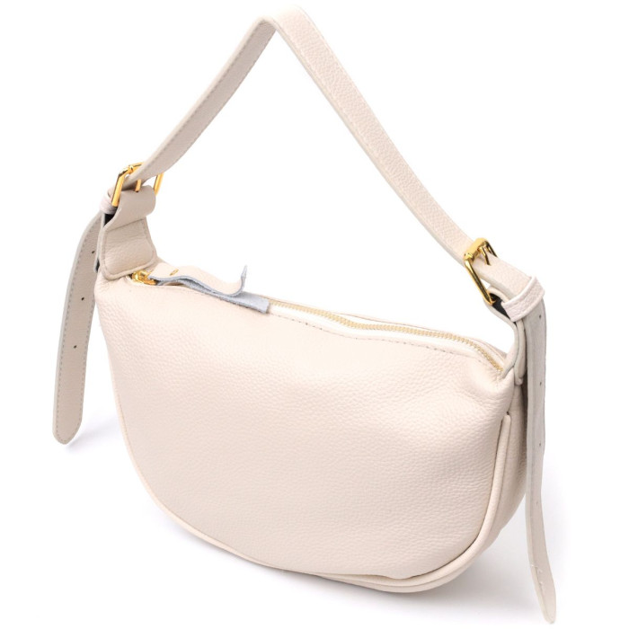 Напівкругла стильна жіноча сумка на плече з натуральної м'якої шкіри, яка дуже добре показала себе в експлуатації. Аксесуар складається з основного відділення, потайної кишені на блискавці та кишені відкритого типу. Носити сумку можна на плечі та через плече, для цього є шкіряний незнімний регульований ремінь. У виробі використано якісну фурнітуру кольору жовтого золота. Універсальний варіант сумки як на вечір так і як сумочка на кожен день.
