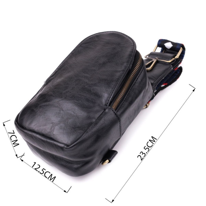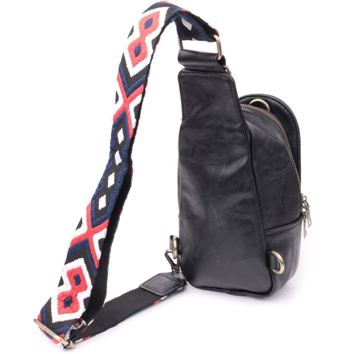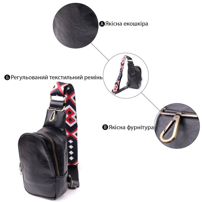 Примітна жіноча сумка через плече на кожен день із якісного екошкіри, яка є альтернативою натуральній шкірі. Дана модель складається з одного основного відділення, яке закривається на блискавку і в якому знаходяться три кишені для кредитних карток усередині, а також однієї потайної кишені на лицьовій стороні, що закривається на магніт і на карабін. Акцентом даної моделі є зручний регульований плечовий ремінець у етнічному стилі, що дуже модно вже кілька сезонів. Екошкіра – високоякісна альтернатива натуральному матеріалу, яка дуже стійка до тертя, до низьких температур, відмінно носиться на відміну від інших штучних матеріалів, а також має гіпоалергенний склад на відміну від натуральної шкіри. Мода не стоїть на місці, на зміну класичним сумкам приходять нові моделі, які обумовлені сучасним часом, саме такою є слінг сумка – зручна, практична, невелика, але містка та головне якісна.