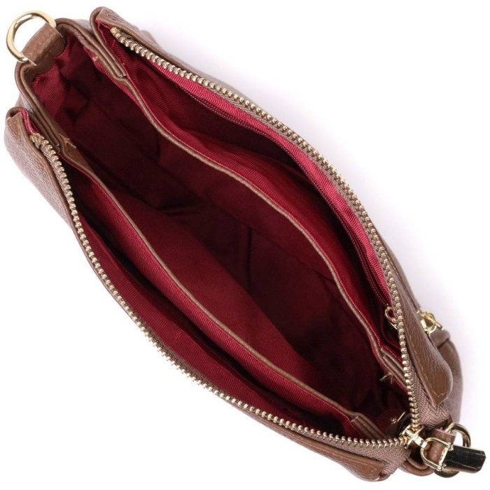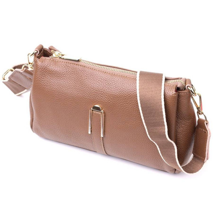 Жіноча сумка з красивою металевою прикрасою посередині. Виріб пошитий з натуральної шкіри з високим показником якості та зносостійкості. Аксесуар складається з трьох основних відділень, потайної кишені на блискавці, кишені відкритого типу та кишені на блискавці зовні. Носити сумку можна під рукою, на плечі та через плече, для цього є текстильний ремінь, що знімається. У виробі використано якісну фурнітуру кольору жовтого золота. Універсальний варіант сумки як на вечір так і як сумочка на кожен день.