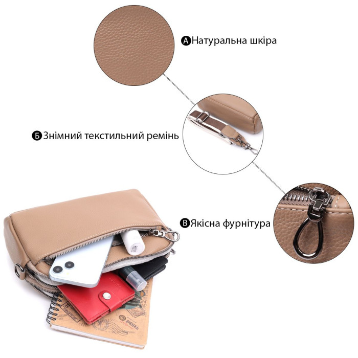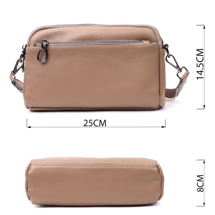 Стильна сумка жіноча на всі випадки з натуральної шкіри флотар, яка має зернисту фактуру. У виробі використано шкіру бежевого кольору. Аксесуар складається з двох відділень, які закриваються на блискавці, потайної кишені на блискавці та кишені відкритого типу, а також двох кишень зовні на лицьовій та тильній стороні. Носити сумку можна в руці, під рукою, на плечі і через плече, для цього є текстильний ремінь, що знімається. В аксесуарі використано якісну фурнітуру кольору темного срібла. Відмінний варіант для подарунка близьким та дорогим дівчатам та жінкам.