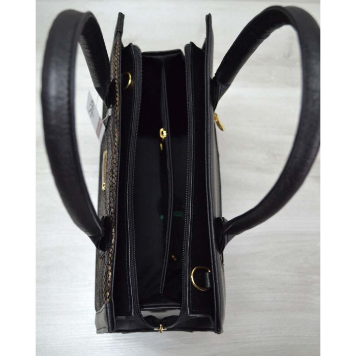 Жіноча сумка Бочонок чорного кольору зі вставкою кавовий крокодил WeLassie