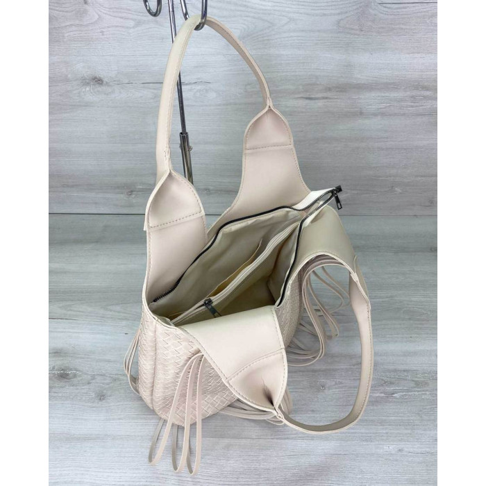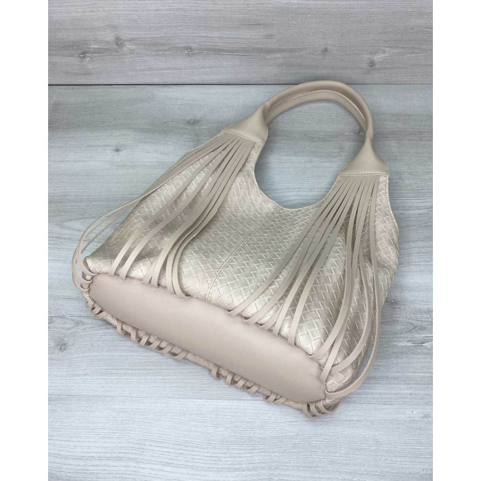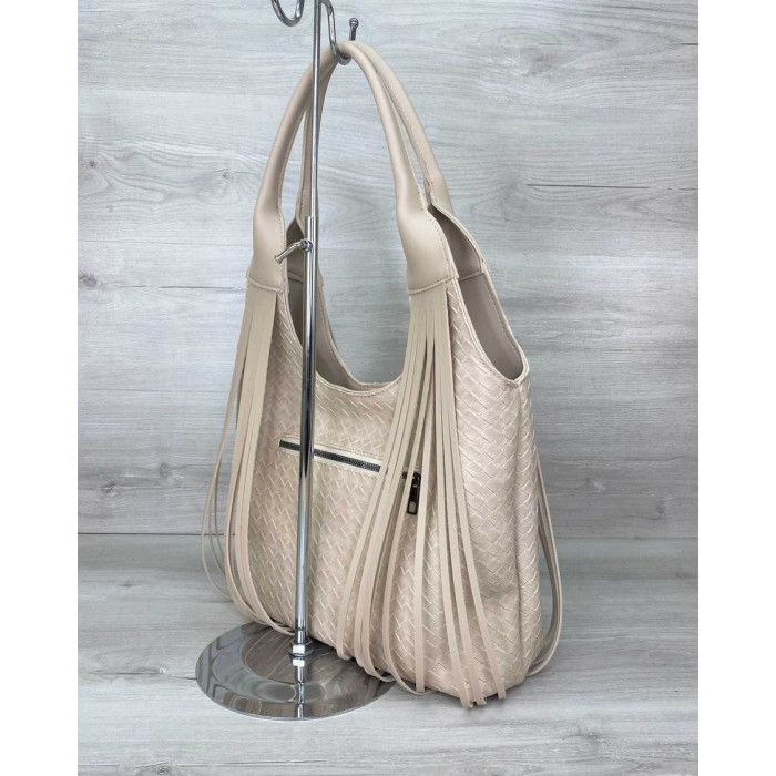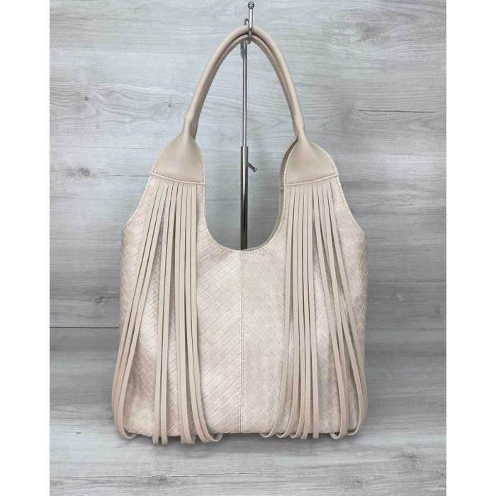 Сумка жіноча 63819 виробник Welassie Одеса, виконана з екошкіри високої якості. Сумка прикрашена бахромою. Відкривається за допомогою блискавки. Усередині сумка на щільній підкладці, поділена на дві частини вшитою посередині косметичкою на блискавки. Також є всередині дві кишені: на блискавці і відкрита. Зовні є кишеня для дрібних предметів.