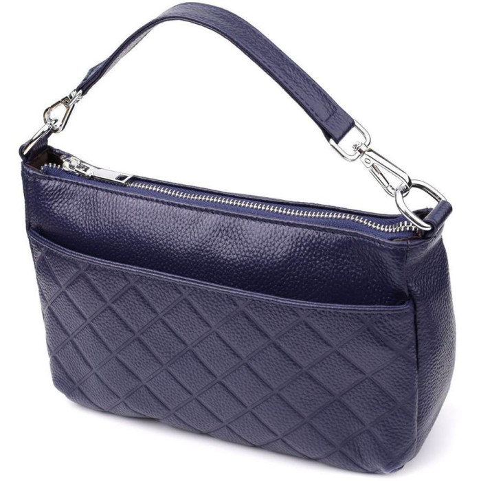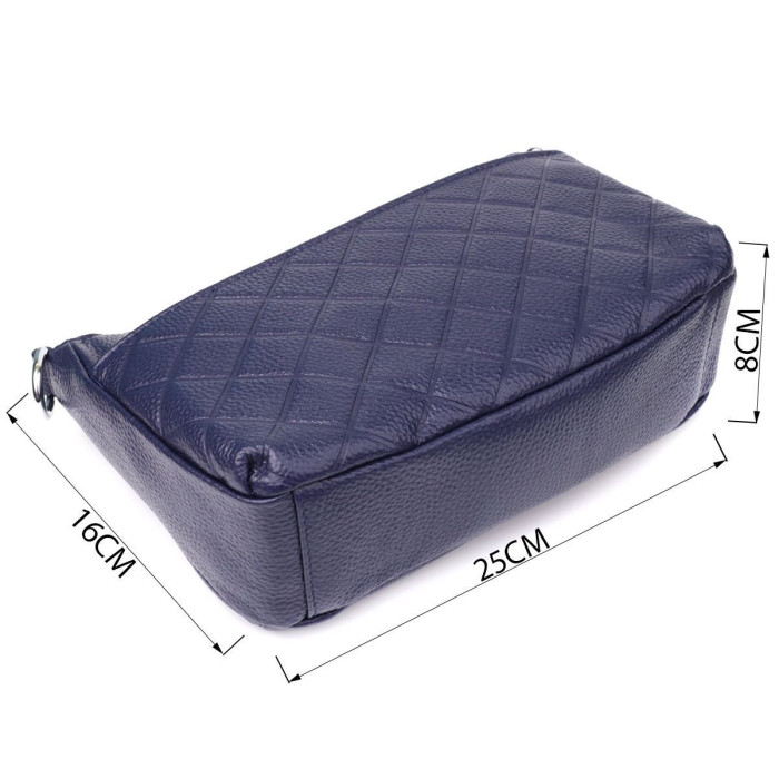 Елегантна фурнітура сріблястого кольору гармонійно поєднується з глибоким синім відтінком шкіри, підкреслюючи стиль та якість виробу. Для комфортного носіння сумка комплектується двома знімними ремінцями зі шкіри, що дозволяє використовувати її як на плечі, так і як кросбоді. Це універсальне рішення для повсякденного використання та особливих випадків.