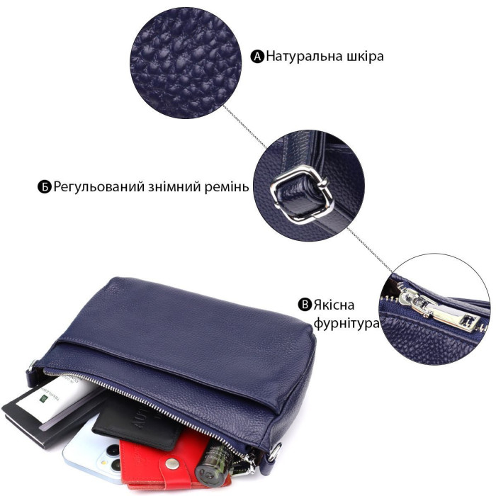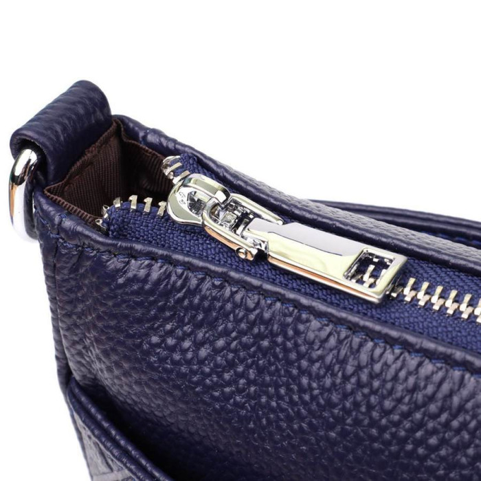 Сумка виконана з якісної, м'якої та приємної на дотик натуральної шкіри насиченого синього кольору, яка надає виробу елегантності та довговічності. З боків розташовані дві прилеглі кишені, що також закриваються на блискавці, що додає функціональності та допомагає краще організувати простір.