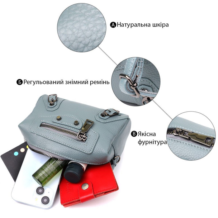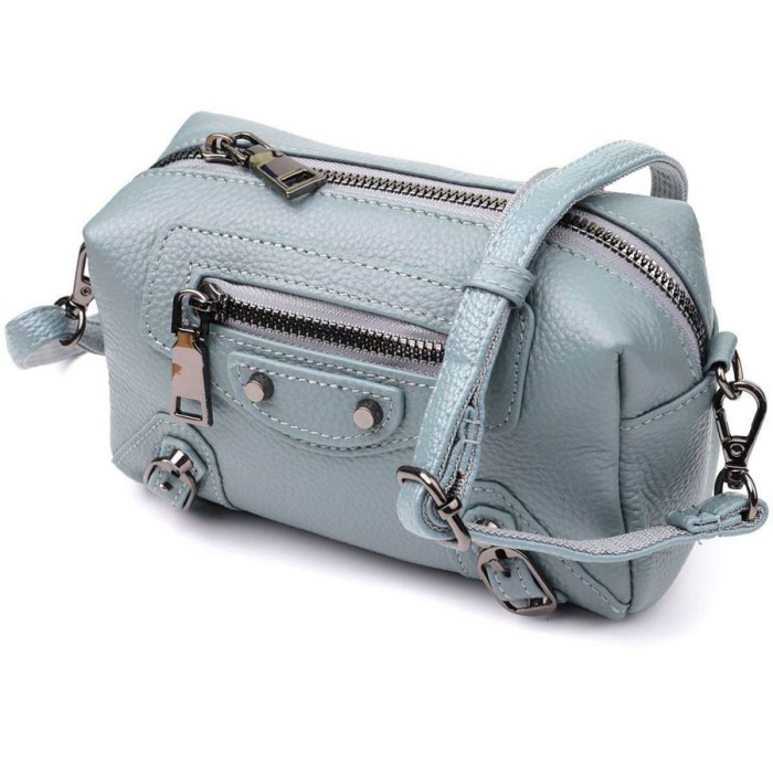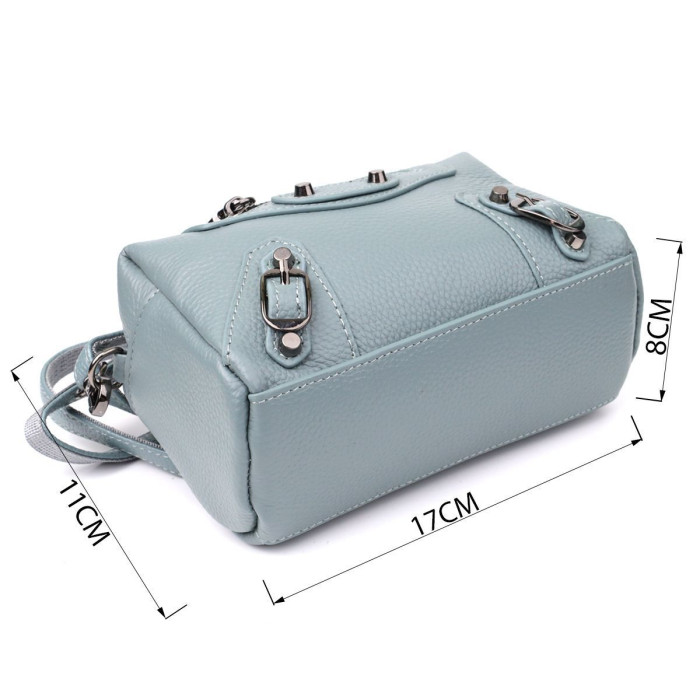 Невелика жіноча шкіряна сумка у блакитному кольорі з декоративною фурнітурою – свіжий акцент із характером. Ця компактна модель виконана з натуральної шкіри в ніжному блакитному відтінку, який надає образу легкість та витонченість. Основна увага в дизайні приділена декоративним деталям: металеві заклепки, ремінці та фігурний рядок на лицьовій стороні додають стилю динаміки та оригінальності.