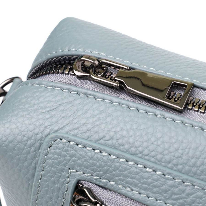 Фурнітура у кольорі темного срібла ефектно контрастує з блакитним тлом, наголошуючи на сучасності моделі. Завдяки знімному регульованому ременю сумку зручно носити через плече або на плечі.