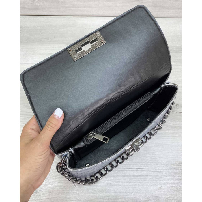 Жіноча сумка клатч 61803, виробник Welassie (Україна) виготовлені зі штучної шкіри. Кришка відкривається за допомогою клапана. Всередині без підкладки, має відділення на блискавці. Малюнок на сумки не однорідний. Сумка прикрашена ланцюжком, яку можна використовувати як ручку. В комплекті є регульований плечовий ремінець.