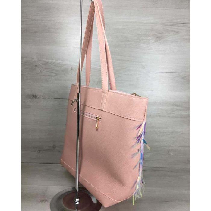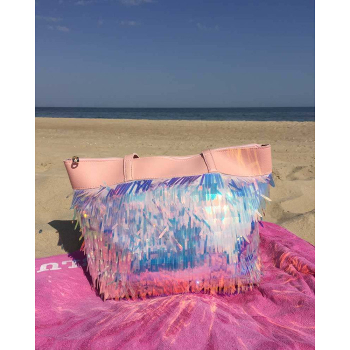 Жіноча сумка "Пляж", виготовлена з штучної шкіри. Передня частина сумки прикрашена паєтками у вигляді бурульок мерехтливої кольору, які переливаються на сонці. Відкривається за допомогою блискавки. Всередині має щільну підкладку і дві кишені, одна на блискавці, інша відкрита. Зовні - кишеня на блискавці для дрібних предметів. Довжина ручок розрахована, щоб носити сумку на плечі.