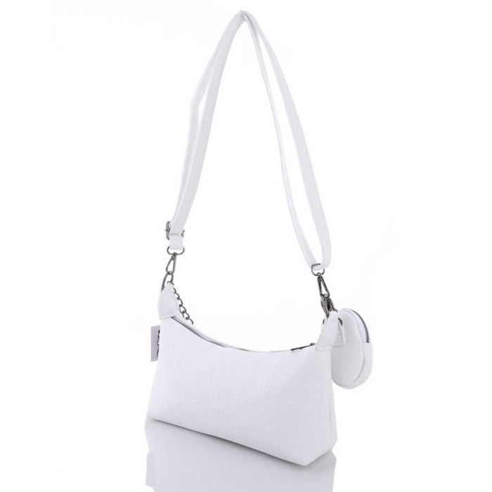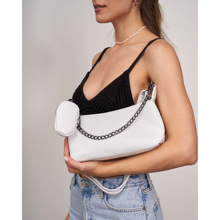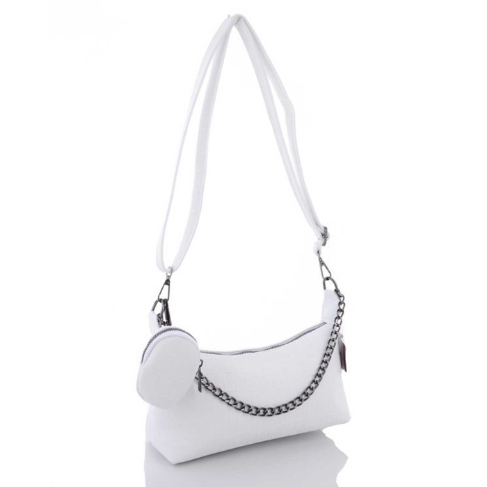 Жіноча сумка 64820 від виробника «Welassie» Україна, колір білий, матеріал сумки екошкіра високої якості. Сумка відкривається за допомогою застібки-блискавки. Усередині сумка на щільній підкладці є відкрита кишеня для дрібних предметів. Плечовий ремінь укріплений стопою, регулюється під різну довжину, максимальна довжина 140 см. Сумка прикрашена ланцюжком, який можна використовувати як ручку. Довжина ланцюжка 41 см. У комплекті є маленька сумочка-гаманець на застібці з розмірами: довжина 7 см, ширина 3 см, висота 10 см.