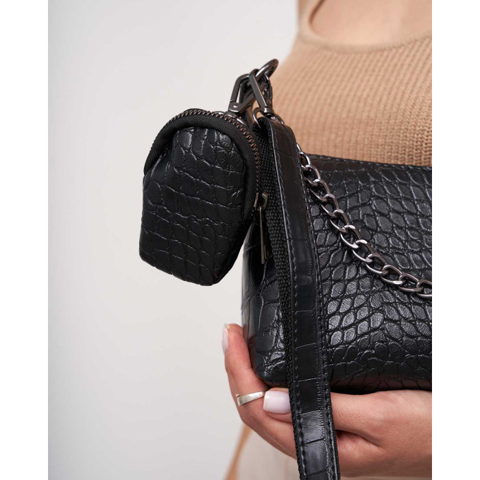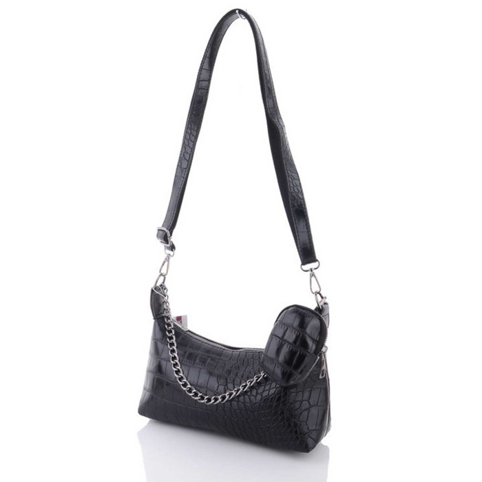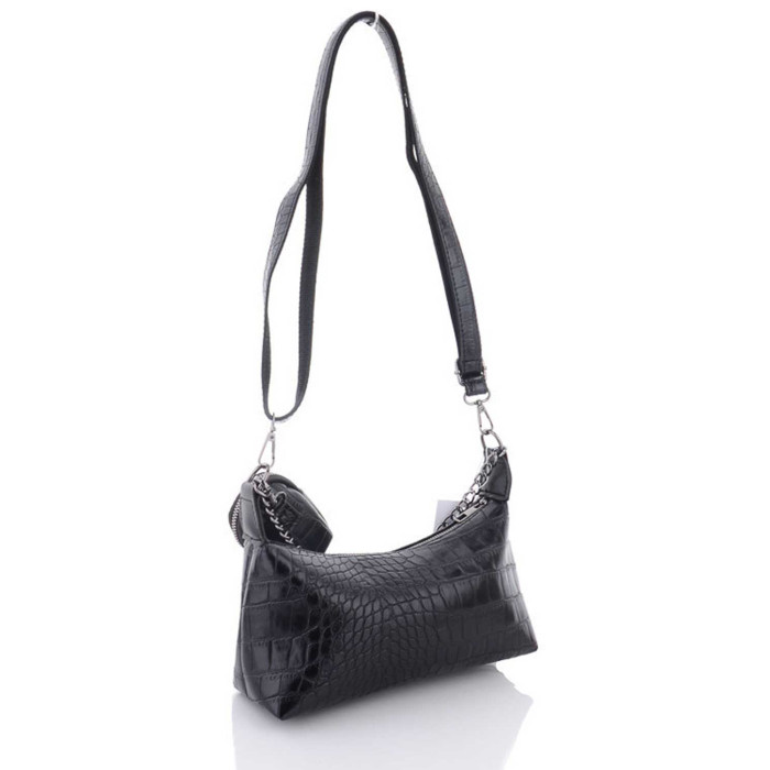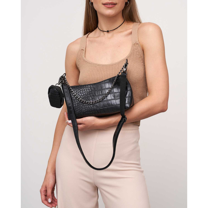 Жіноча сумка 64826 від виробника «Welassie» Україна, колір чорний, матеріал сумки екошкіра високої якості. Сумка відкривається за допомогою застібки-блискавки. Усередині сумка на щільній підкладці є відкрита кишеня для дрібних предметів. Плечовий ремінь укріплений стопою, регулюється під різну довжину, максимальна довжина 140 см. Сумка прикрашена ланцюжком, який можна використовувати як ручку. Довжина ланцюжка 41 см. У комплекті є маленька сумочка-гаманець на застібці з розмірами: довжина 7 см, ширина 3 см, висота 10 см.